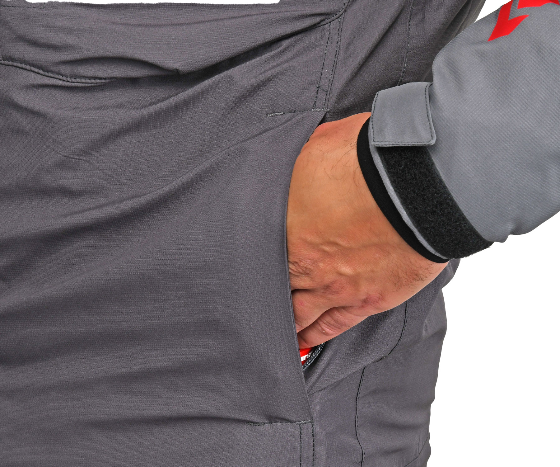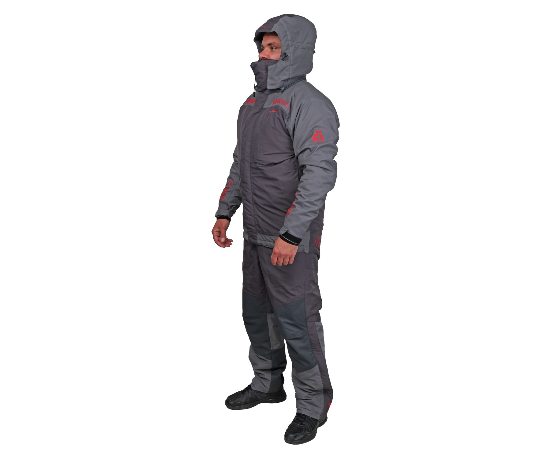 Куртка застібається на центральну блискавку, яку прикрито клапаном на липучках. Виріб забезпечений глибоким капюшоном і високим штормовим коміром. У куртці є дві просторі утеплені бічні кишені та нагрудна кишеня на водонепроникних блискавках, а також внутрішня кишеня на блискавці для мобільного телефону чи документів. Для зручності регулювання та збереження тепла краї рукавів мають стяжки на липучках та внутрішні еластичні манжети. Передбачено регулювання капюшона гумовими стяжками-фіксаторами в задній частині та з боків, а також зручне стягування низа куртки. Штани мають високу спинку, зручні регульовані підтяжки на застібках фастекс, поясні стяжки, широкі лямки під поясний ремінь, дві бічні кишені на блискавках та низ штанин із блискавками й фіксаторами на липучці для зручного вдягання чобіт та іншого взуття.