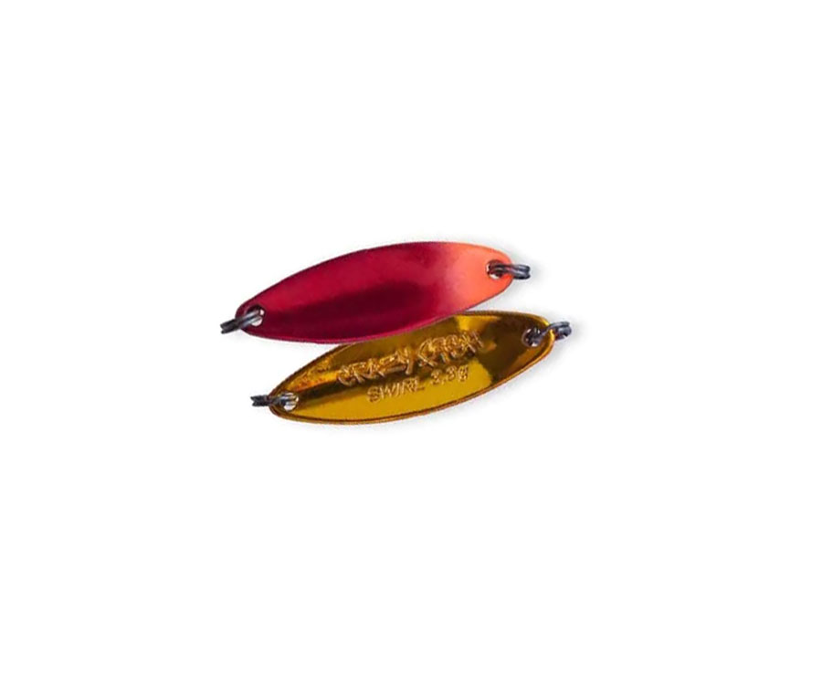 Crazy Fish Swirl — далекобійна блешня форелі, жереха та голавля. Crazy Fish Swirl — витягнутої форми блешня вагою 3.3 грам, що нагадує вербовий листок. Призначена для ловлі на течії голавля, жереха, язя і форелі, тому зроблена з досить товстого металу. Відмінно летить навіть при сильному бічному вітрі завдяки своїй формі та відносно великій вазі за малого розміру. Відмінна робота блешні на падінні дозволяє розширити діапазон проводок і ловити нею не тільки на рівномірній проводці, а з паузами. При цьому коливалку можна покласти на дно, виконуючи джигову проводку, робити сходинку в товщі води або ж давати просто короткі паузи для збою приманки, що часто дає чудові результати! Також Swirl добре відгукується на твічинг, таким чином, для різноманітності в проводці та досягнення максимального результату іноді можна давати блешні ривочки, що чергуються з паузами та рівномірністю. Також до її плюсів слід віднести здатність прийняти необхідний обрій проводки, що зумовлено саме товщиною металу. На течії Swirl не виносить на поверхню, а в стоячій воді приманку можна провести глибше, ніж коливаючі блешні, з більш тонкого металу. Це дає можливість обловити більше місць і провести принаду спокусливіше пасивного хижака.