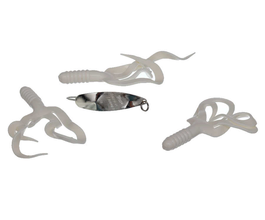 Mepps Timber Doodle - незачіпляйка, що оснащується силіконовим чотирьохвостовим твістером (SPLIT DOOBLE TAIL). Дуже часто велика риба влаштовує свої стоянки в складних для лову місцях, таких як корчі або зарості водної рослинності, де можна легко сховатися й полювати за рибкою, яка зазівалася. Саме для таких випадків і призначена блешня Mepps Timber Doodle. По суті, це все той самий Syclops, але оснащений високоякісним одинарним гачком і шпилькою для фіксації головної частини м'якої пластикової приманки SPLIT DOOBLE TAIL (чотирихвостий твістер). Її кінчик фіксується на вістрі гачка, надійно захищаючи його від зачепів. Гачок стає вільним навіть за слабкого клювання. За зовнішнім виглядом такі твістери нагадують бур'ян. Вони роблять хаотичні рухи під час плавання. Їхні щупальця вібрують під час падіння. Вони мають вертикальну гру й однаково придатні як для лову закиданням, так і доріжкою. Крім стандартного оснащення можливе застосування однохвостих твістерів з тілом зручним для фіксації. Mepps Timber Doodle дуже хороша і зручна приманка для лову щуки, судака, великого окуня. Timber Doodle випускається у срібному, золотому і чорному кольорі. Кожен з них комплектується трьома силіконовими приманками.