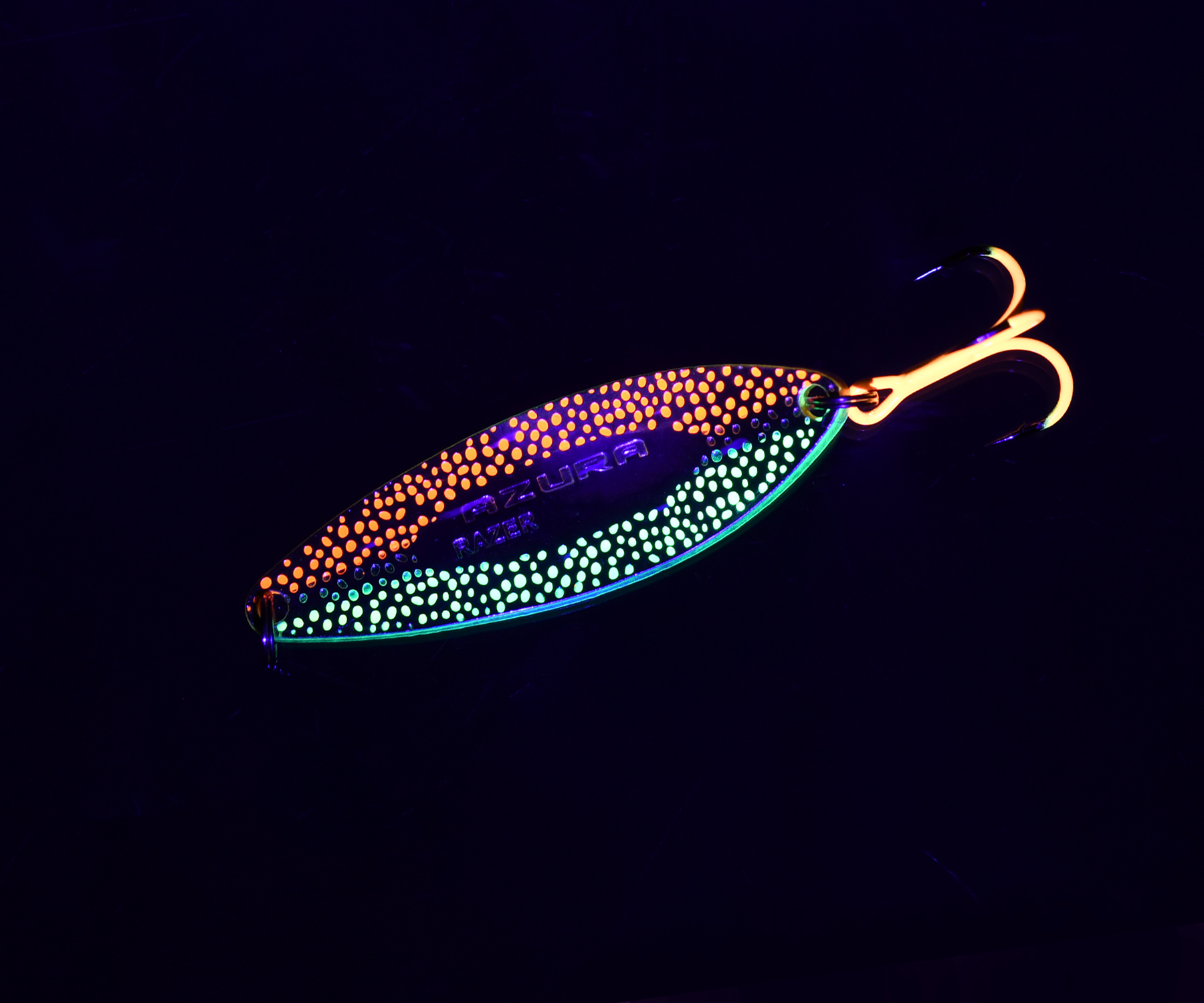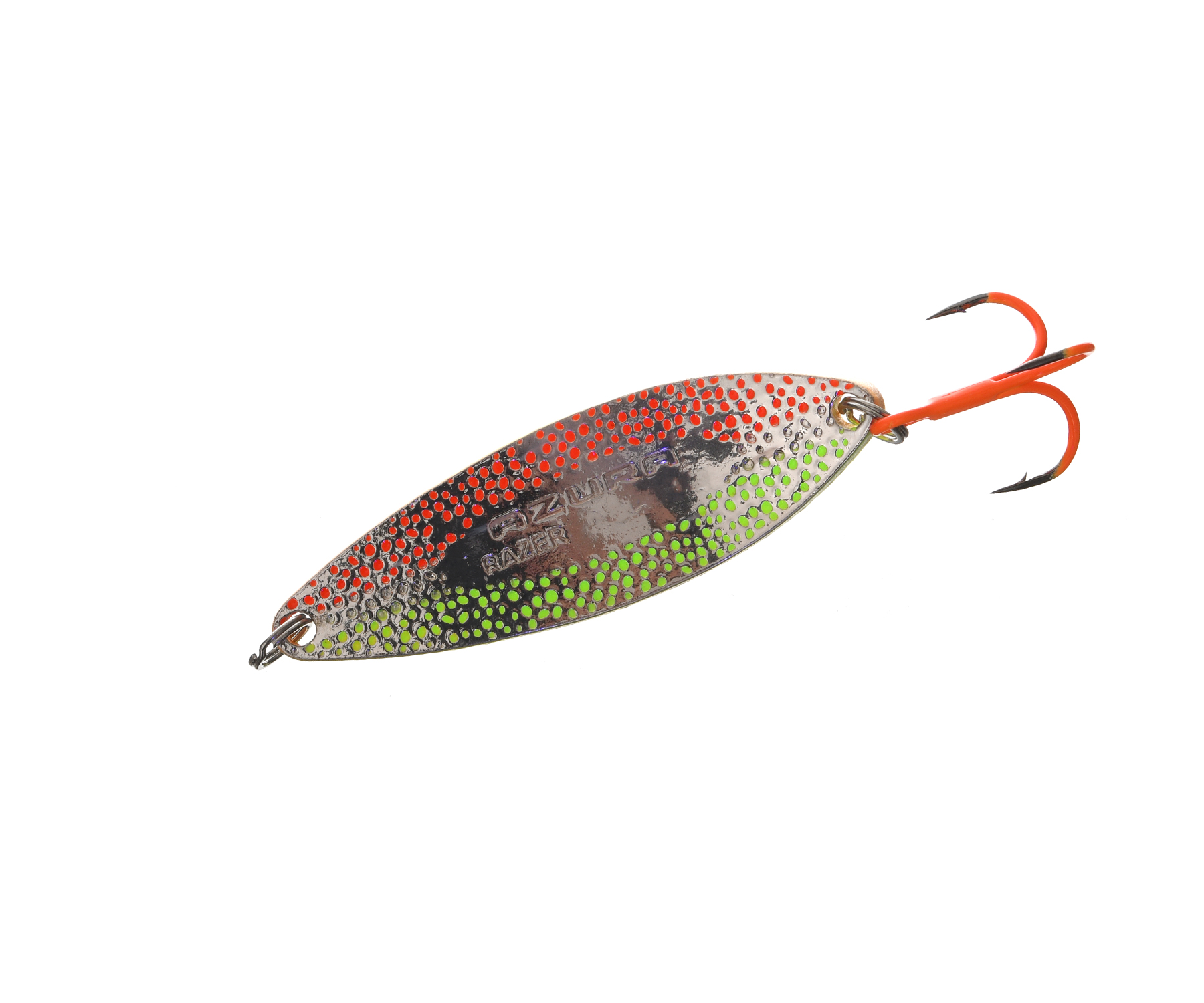 Блешні Azura Razer – серія висококласних коливних блешень довгастої звуженої форми, виготовлених із латуні. Завдяки своїй формі та унікальному профілю блешня Azura Razer має досить активну компактну гру, під час якої переважно працює її задня частина, що створює потужні низькочастотні коливання, привабливі для будь-якого хижака. Блешня створювалася для ловлі на швидких річках, тому чудово тримає течію, не спливає на поверхню та вирізняється високою стабільністю гри. Водночас затоки річок, озера, протоки та водосховища без течії також є вотчиною цієї приманки, яка збирає і тут багату данину! Приманка відмінно збалансована, чудово тримає глибину проведення і має неймовірні аеродинамічні характеристики, що дають змогу виконувати далекі та наддалекі закидання, тобто не лише працювати по площах, а й діставати до найобережнішої риби. Специфічна рельєфна зовнішня поверхня блешні не тільки робить привабливим її зовнішній вигляд, але і створює під час проведення мерехтливі відблиски та мікрозавихрення води, що викликають у хижих риб жвавий інтерес і провокують їх на миттєву атаку. Блешня дуже універсальна й демонструє феноменальні результати уловистості як на повільних і середніх, так і на високих швидкостях проведення. У списку її трофеїв щука, окунь, білизна, головень, судак, лосось та інші хижаки. Коливалки Azura Razer – чудовий приклад поєднання перевіреної часом японської класики та сучасних технологій. Приманки оснащені надійними завідними кільцями та найгострішими трійниками, доступні в широкому спектрі уловистих забарвлень, мають довжину 54, 58, 62 мм і вагу 14, 16, 21 г відповідно.