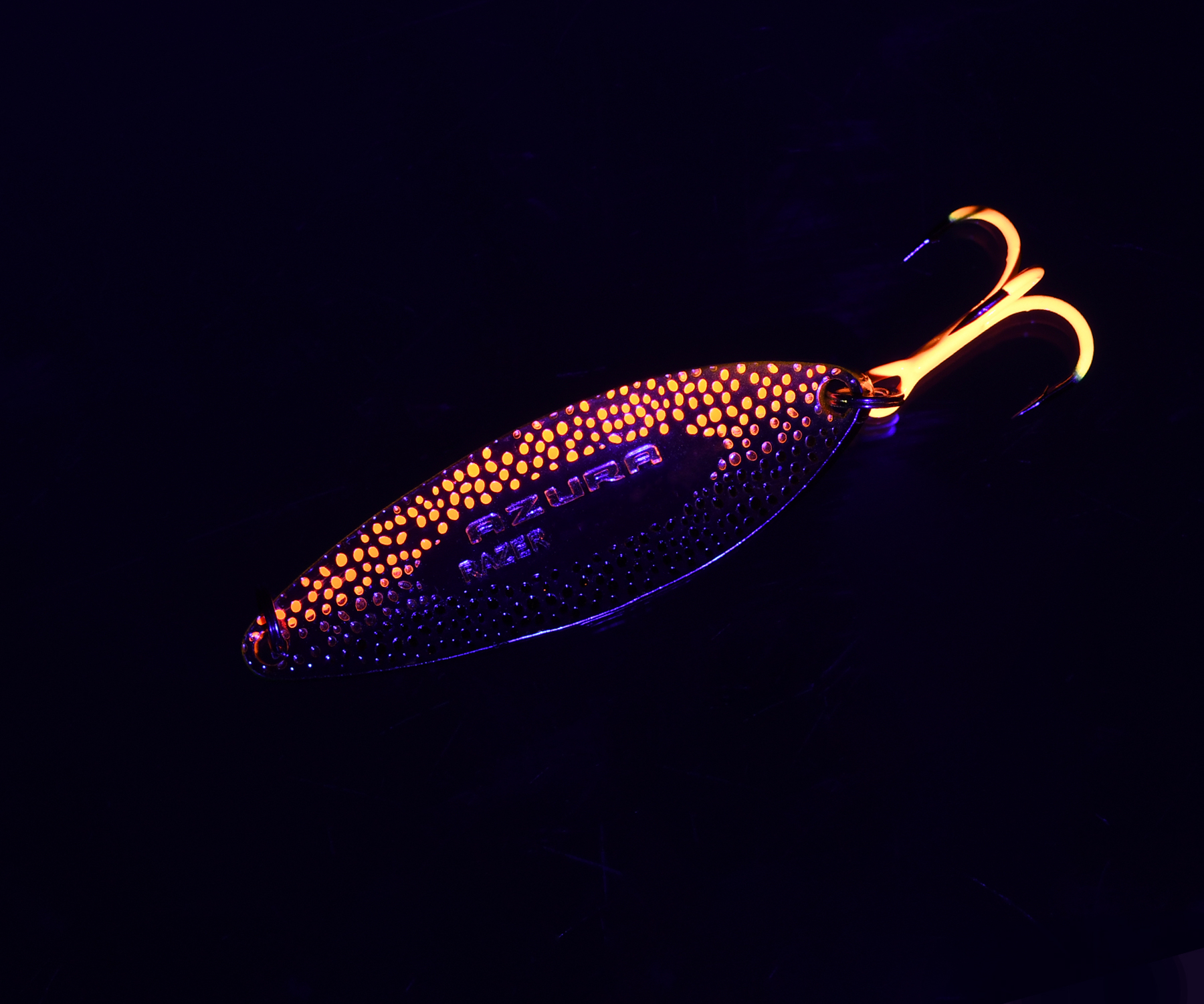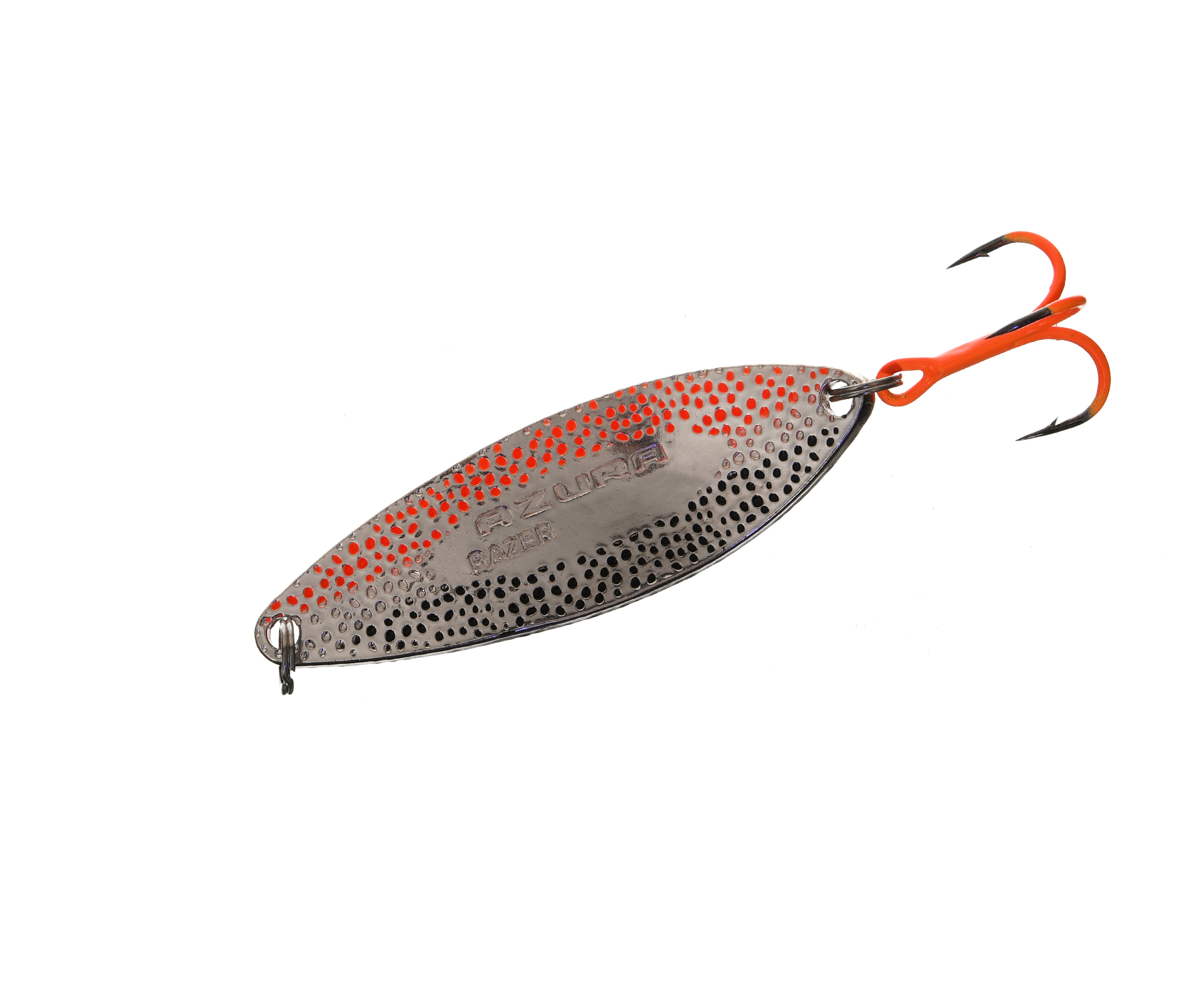 Блешні Azura Razer – серія висококласних коливних блешень довгастої звуженої форми, виготовлених із латуні. Завдяки своїй формі та унікальному профілю блешня Azura Razer має досить активну компактну гру, під час якої переважно працює її задня частина, що створює потужні низькочастотні коливання, привабливі для будь-якого хижака. Блешня створювалася для ловлі на швидких річках, тому чудово тримає течію, не спливає на поверхню та вирізняється високою стабільністю гри. Водночас затоки річок, озера, протоки та водосховища без течії також є вотчиною цієї приманки, яка збирає і тут багату данину! Приманка відмінно збалансована, чудово тримає глибину проведення і має неймовірні аеродинамічні характеристики, що дають змогу виконувати далекі та наддалекі закидання, тобто не лише працювати по площах, а й діставати до найобережнішої риби. Специфічна рельєфна зовнішня поверхня блешні не тільки робить привабливим її зовнішній вигляд, але і створює під час проведення мерехтливі відблиски та мікрозавихрення води, що викликають у хижих риб жвавий інтерес і провокують їх на миттєву атаку. Блешня дуже універсальна й демонструє феноменальні результати уловистості як на повільних і середніх, так і на високих швидкостях проведення. У списку її трофеїв щука, окунь, білизна, головень, судак, лосось та інші хижаки. Коливалки Azura Razer – чудовий приклад поєднання перевіреної часом японської класики та сучасних технологій. Приманки оснащені надійними завідними кільцями та найгострішими трійниками, доступні в широкому спектрі уловистих забарвлень, мають довжину 54, 58, 62 мм і вагу 14, 16, 21 г відповідно.