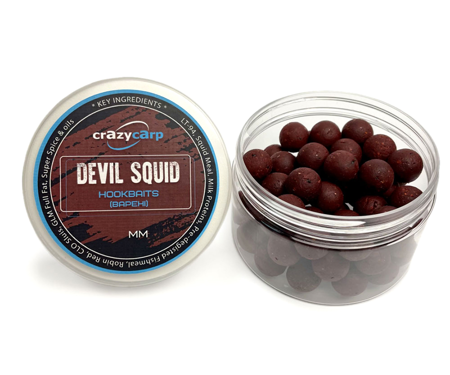 Варені бойли Crazy Carp HookBaits Devil Squid мають натуральний темний колір, який виникає під час змішування натуральної поживної суміші, що не містить синтетичних барвників. Бойли Crazy Carp HookBaits розроблено з урахуванням виключної привабливості для коропа. Ці легкозасвоювані й поживні приманки мають усе необхідне для повноцінного харчування та довгого і здорового життя риби. Devil Squid виготовлено з дуже успішного базового міксу на основі рибного борошна. Мікс містить кращу рибну муку LT-94 (Норвегія), борошно з кальмара (Перу), ферментовану рибну муку (Франція), молочний протеїн (Німеччина), пташиний корм Haith's CLO, легендарний Robin Red (Haith's), гідролізований рідкий рибний білок, стимулятор апетиту Betaine HCL (Нідерланди), клітини дріжджів, підсолоджувач Thaumatin-B, вітаміни, спеції, а також найкращий екстракт із зеленогубої мідії (GLM Full Fat) та інші секретні інгредієнти. До цього всього додано справжній екстракт із кальмара, який дає дуже потужний харчовий сигнал для коропа та навіть може викликати звикання риби. Ароматизатори, які використовуються в цих бойлах Crazy Carp HookBaits – Squid (кальмар), Plum (слива) і Black Pepper Oil (олія чорного перцю).