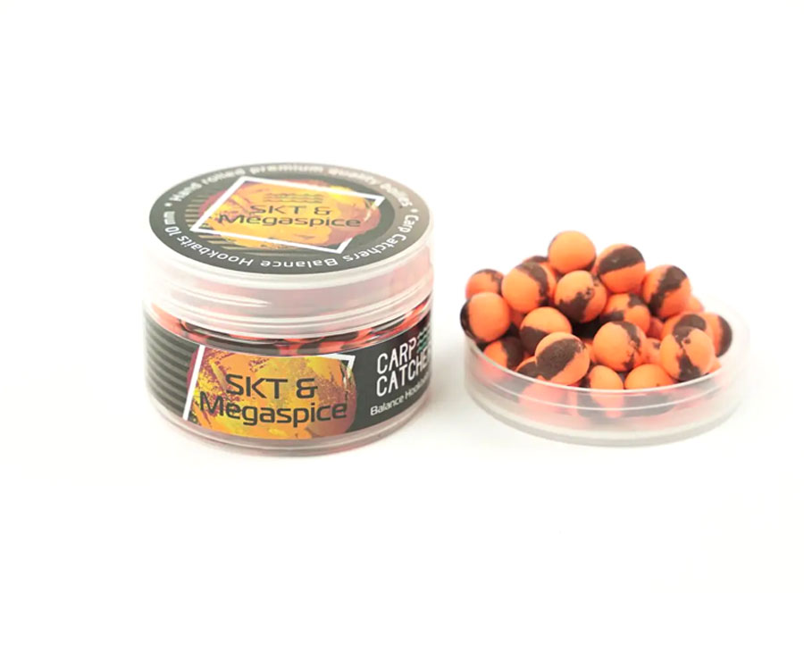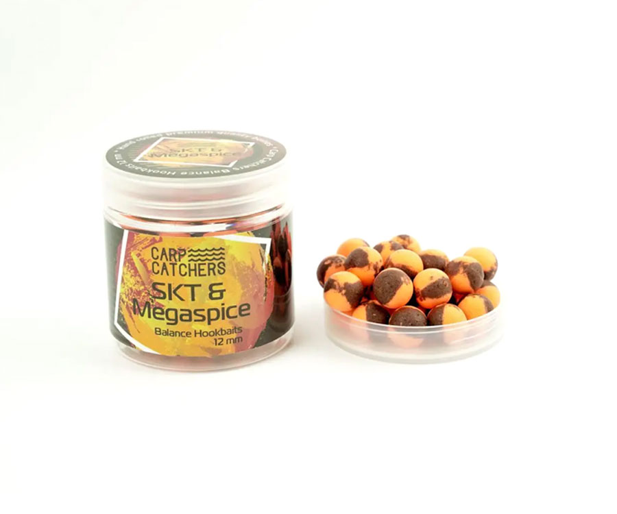 Баланс SKT&Megaspice – поєднання насадочного донного бойлу SKT і поп-апа Megaspice у яскравому флюоро-помаранчевому кольорі. Бойли SKT виготовлені на основі кількох типів борошна з морепродуктів, молочних та рослинних протеїнів. Поп-ап Megaspice – поп-ап з ароматом спецій. Насадочні бойли баланс є плаваючою насадкою, що складається з 2 частин вареного тонучого і 2 частин плаваючого бойла. Плавучість балансу 12 мм є достатньою, щоб поставити на жало або підняти (залежно від бойла) гачок №6 і поставити на жало гачок №4. За бажанням ви можете збільшити або зменшити плавучість балансу, підрізавши донну або плаваючу його частину. Обов’язково перевіряйте презентацію оснастки зі своїми гачками: гачки різних виробників мають різну вагу.