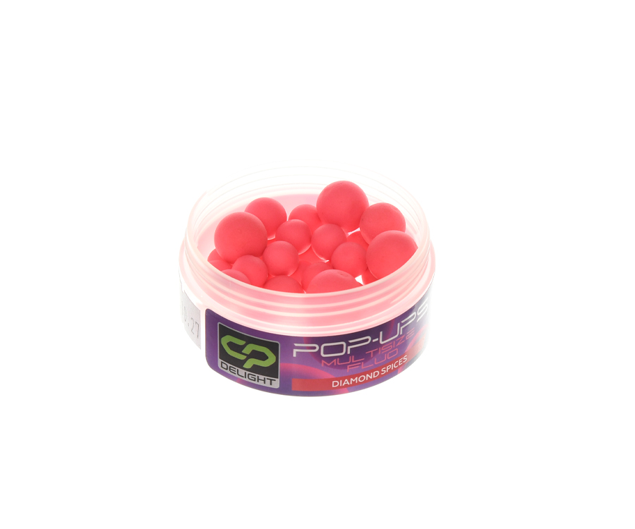 Carp Pro Delight Multisize Fluo Pop Ups – плаваючі бойли вищої якості, які розроблені експертами компанії Carp Pro разом із відомим спортсменом Олексієм Пугачем та ідеально підходять для класичної та метод-фідерної ловлі коропа. Бойли Delight Multisize Fluo Pop Ups виготовлено з використанням високоякісних інгредієнтів, що постачаються з європейського ринку – це зернові, стимулятори апетиту, ароматизатори, підсолоджувачі, барвники та бетаїн. У серії є класичні та фруктові запахи, солодкі аромати, спеції та їх комбінації, що особливо привабливі для коропа та іншої великої риби. Плаваючі бойли Carp Pro Delight Multisize Fluo Pop Ups абсолютно нешкідливі для риби та інших підводних мешканців. Мають унікальне поєднання яскравих кольорів, смаків і запахів, які швидко поширюються у воді, приваблюючи рибу. Це чудові приманки для швидких риболовних сесій. Delight Multisize Fluo Pop Ups у розмірах 8, 10 і 12 мм розфасовано в зручну герметичну упаковку, що дає змогу тривалий час зберігати їхні робочі якості, а також швидко підібрати приманку потрібного діаметру під умови ловлі та вподобання риби.
