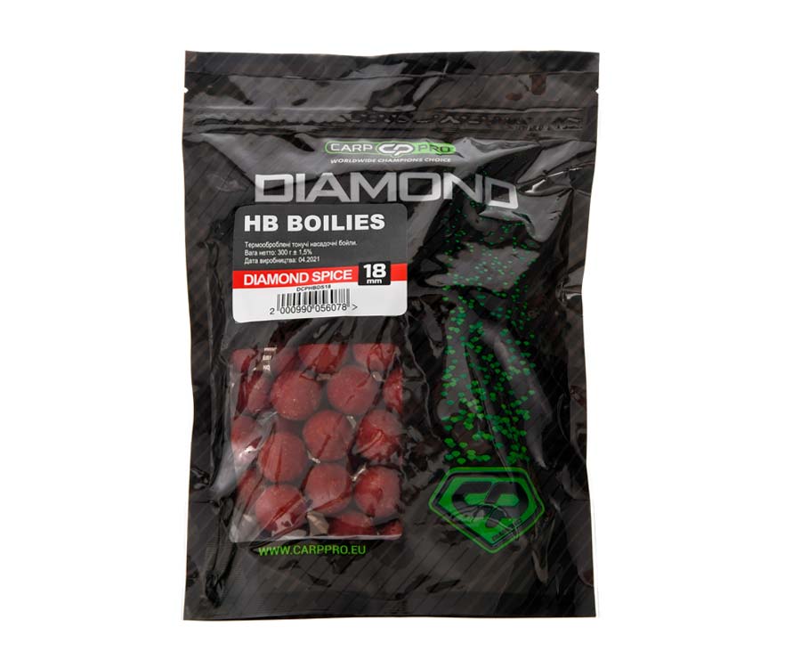 Carp Pro Diamond HB Boilies – найвищої якості класичні бойли, що тонуть, які ідеально підходять для ловлі коропа. Бойли Carp Pro Diamond HB виготовлено з використанням високоякісних інгредієнтів, що поставляються з європейського ринку, та містять необхідні для коропа поживні речовини: зернові екструдати, гідролізатори, амінокомплекси, комплекси мінералів, вітамінів, арома-атрактори. Серію приманок Carp Pro Diamond HookBaits Boilies можна умовно розділити на три смакові гами: рибну, пряну та фруктову. До гами рибних смаків входять кальмар, криль тощо. Ці бойли виготовлено з чотирьох видів зернових, рибної та крилевої складових, комплексу амінокислот і вітамінів. У бойли з пряними смаками крім вищеназваних інгредієнтів введено привабливі для риби прянощі та спеції, а у фруктові бойли такі смаки й аромати, як груша, полуниця, солодка кукурудза, слива тощо. Бойли Carp Pro Diamond випускають у зручній розфасовці і найбільш популярних розмірах. Вони доступні в усіх магазинах компанії Флагман. Їх успішно протестували на багатьох змаганнях наші провідні спортсмени й на цей час позиціонують, як один із найкращих продуктів на українському ринку приманок для ловлі коропа.