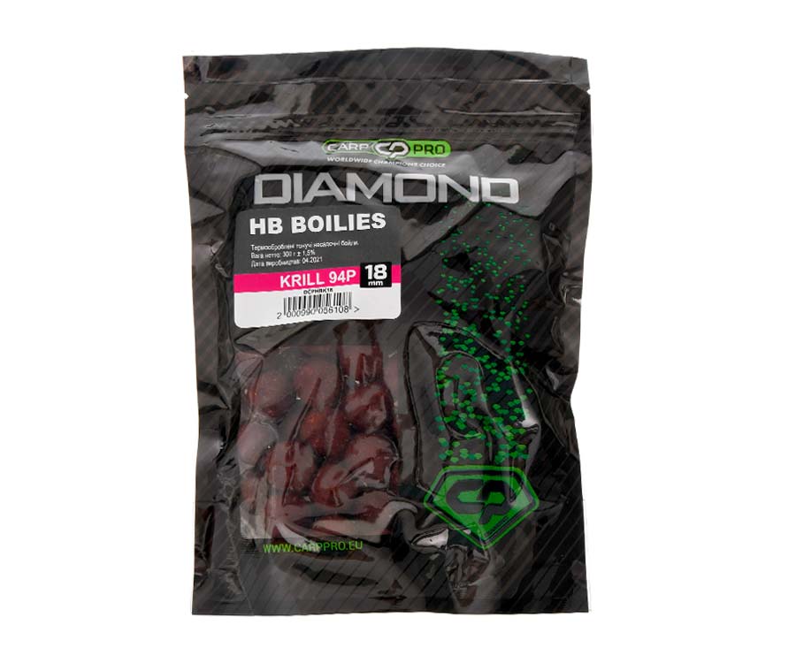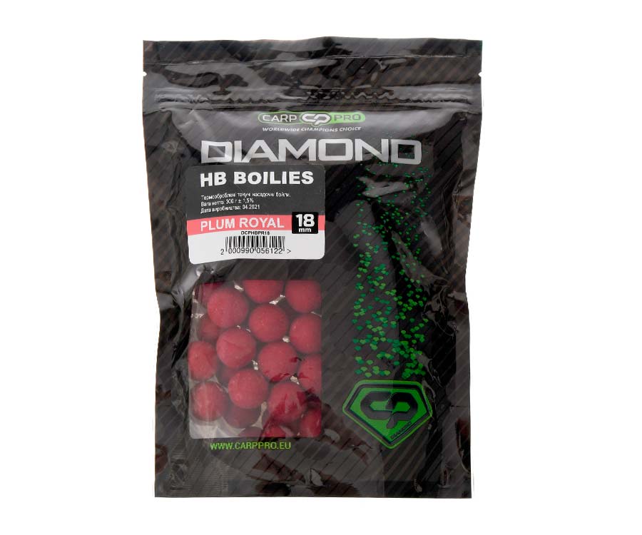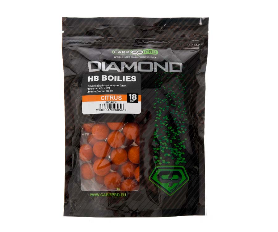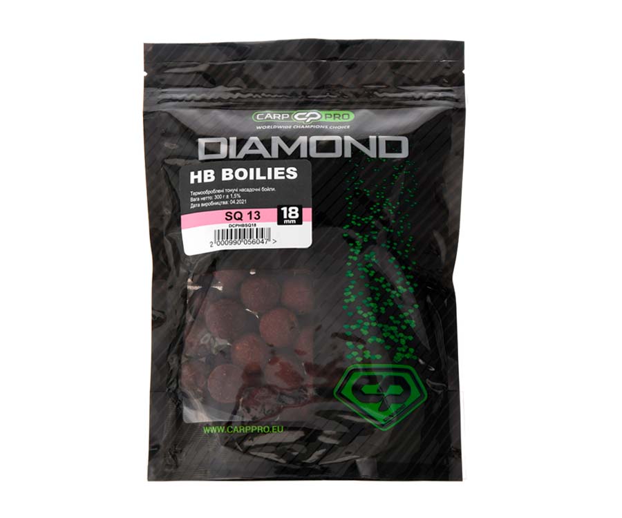 Carp Pro Diamond HB Boilies – найвищої якості класичні бойли, що тонуть, які ідеально підходять для ловлі коропа. Бойли Carp Pro Diamond HB виготовлено з використанням високоякісних інгредієнтів, що поставляються з європейського ринку, та містять необхідні для коропа поживні речовини: зернові екструдати, гідролізатори, амінокомплекси, комплекси мінералів, вітамінів, арома-атрактори. Серію приманок Carp Pro Diamond HookBaits Boilies можна умовно розділити на три смакові гами: рибну, пряну та фруктову. До гами рибних смаків входять кальмар, криль тощо. Ці бойли виготовлено з чотирьох видів зернових, рибної та крилевої складових, комплексу амінокислот і вітамінів. У бойли з пряними смаками крім вищеназваних інгредієнтів введено привабливі для риби прянощі та спеції, а у фруктові бойли такі смаки й аромати, як груша, полуниця, солодка кукурудза, слива тощо. Бойли Carp Pro Diamond випускають у зручній розфасовці і найбільш популярних розмірах. Вони доступні в усіх магазинах компанії Флагман. Їх успішно протестували на багатьох змаганнях наші провідні спортсмени й на цей час позиціонують, як один із найкращих продуктів на українському ринку приманок для ловлі коропа.