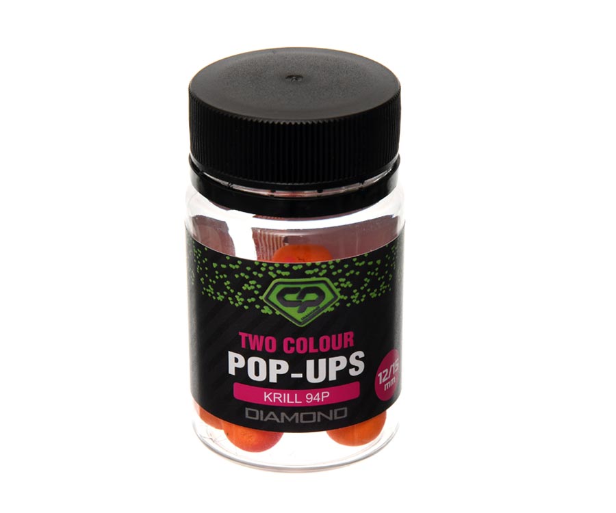 Carp Pro Diamond Pop-Ups Two Collor – високоякісні плавучі бойли, які ідеально підходять для ловлі коропа. Бойли Diamond Pop-Ups Two Collor виготовлено з використанням найкращих інгредієнтів, які постачають з європейського ринку – це зернові, стимулятори апетиту, ароматизатори, підсолоджувачі, барвники та бетаїн. У серії є класичні та фруктові запахи, солодкі аромати й спеції, що особливо привабливі для коропа та іншої великої риби. Бойли Carp Pro Diamond Pop-Ups Two Collor абсолютно нешкідливі для риби та інших підводних мешканців. Мають оригінальне поєднання двох кольорів, смак і запах, який швидко поширюється у воді та приваблює рибу. Це чудові приманки для швидких риболовних сесій. Їх рекомендовано як для класичної ловлі коропа, так і для флет-фідерної ловлі. Diamond Cloudy Pop-Ups випускають у зручній розфасовці: у герметичній баночці знаходяться двокольорні приманки у двох різних розмірах, які вказано на упаковці.