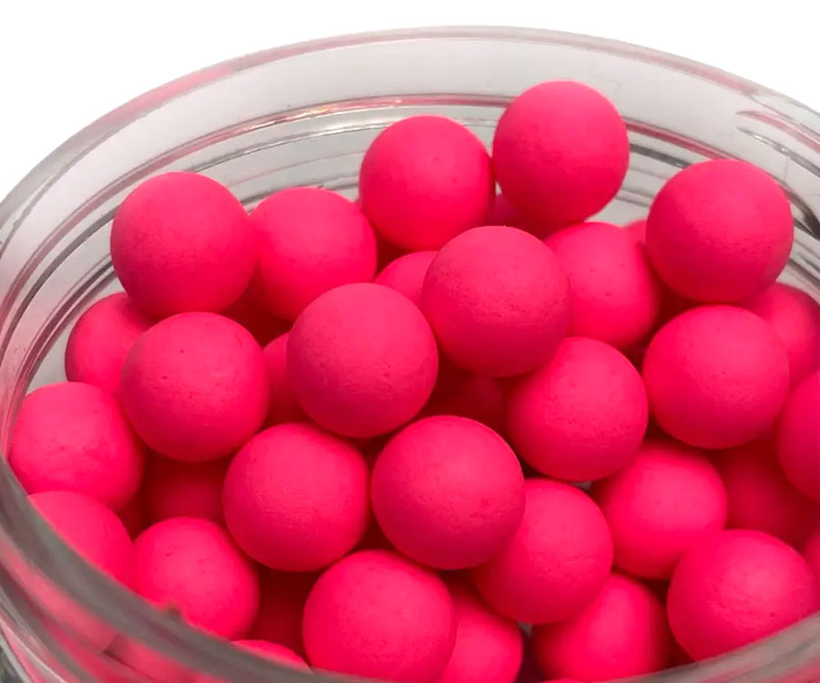 Strawberry: Pop-ups — класична комбінація соковитої полуниці та ефірних масел. Прекрасно працює як самостійна насадка, так і в комбінації з донними бойлами в монтажі "сніговик". Pop-ups виготовлені на новому базовому міксі, що оснований на молочних протеїнах преміум класу, з додаванням бетаїна, підсолоджувача та інших секретних інгредієнтів. Вони мають стабільно високу плавучість, яскравий колір та м'яку губчасту структуру, що дозволяє використовувати навіть товсті голки для проколювання бойлів та легко підрізати при необхідності.