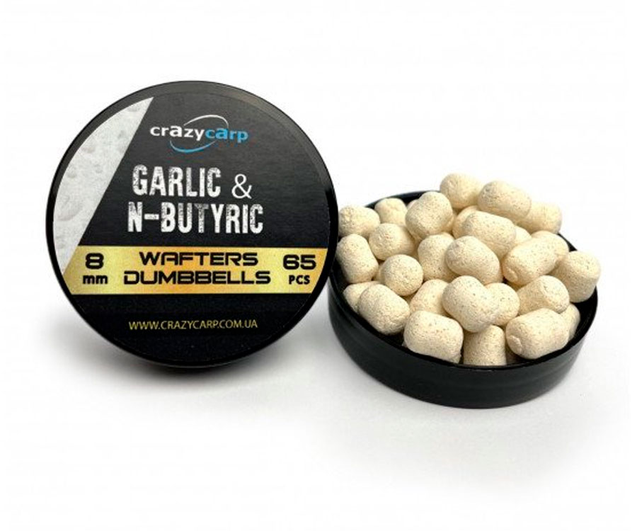 Ці критично збалансовані, добре помітні приманки наповнені аттрактантами, амінокислотами, бетаїном та чудовими ароматами. Кожен колір дуже яскравий і створює сильний візуальний сигнал, який відповідає рівню привабливості, спричиненої стимуляторами апетиту. Володіючи міцною, але губчастою структурою, ці вафтерси можна легко підрізати відповідно до ваших потреб і розміру гачка. Garlic & N-Butyric Wafters Dumbbells (8mm) — часник в білому кольорі є абсолютним фаворитом для багатьох риболовів, а з додаванням масляної кислоти, він стає по справжньому неперевершеною насадкою. Напевно, це найбільш смердючі бойли в нашій лінійці.