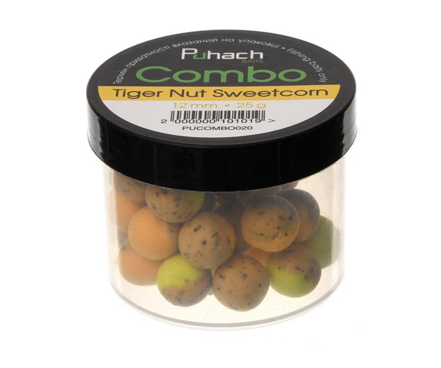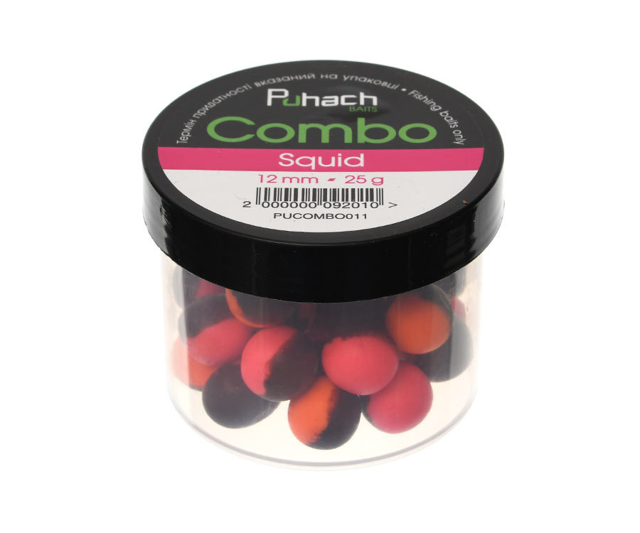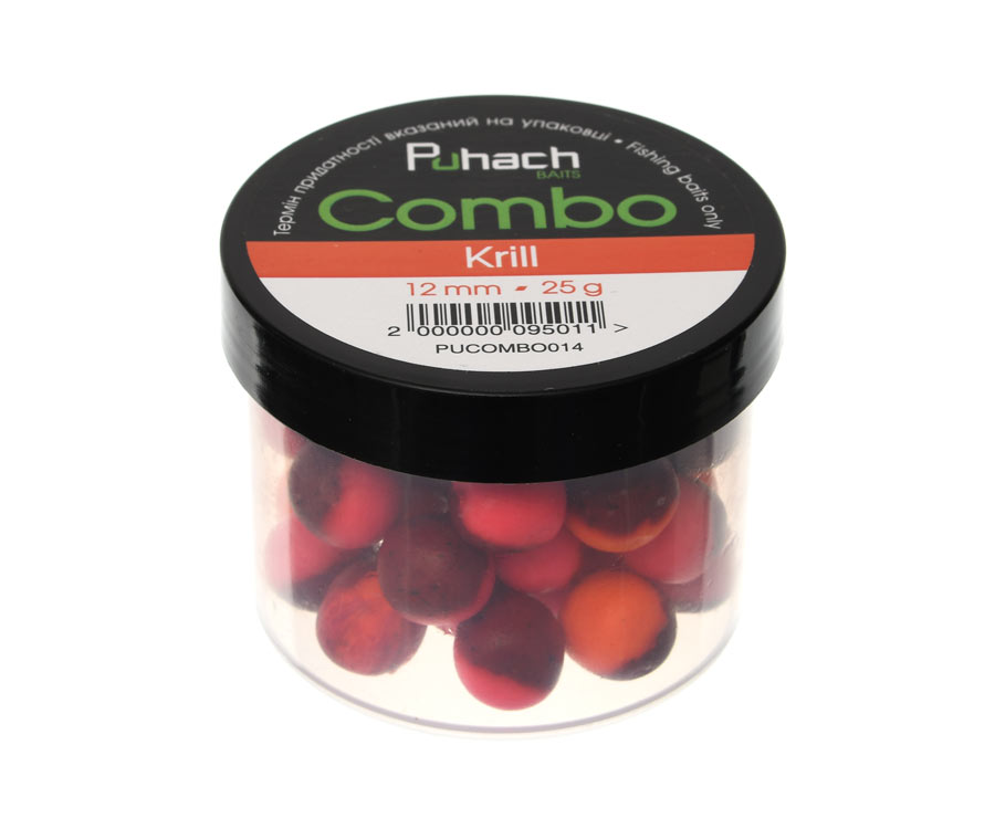Puhach Baits Combo – унікальні бойли нейтральної плавучості та найвищої якості, які створено з комбінації плаваючих і варених бойлів. Розроблені чемпіоном України та відомим риболовом-спортсменом Олексієм Пугачем з урахуванням досвіду українських і міжнародних змагань. Це насадка для збалансованого монтажу: вона не повинна піднімати гачок, її завдання – підняти волос і зробити сам монтаж невагомим для риби. Залежно від розміру бойли Puhach Baits Combo ідеально підходять для ловлі коропа, амура, ляща та іншої великої риби. Приманки виготовлено з використанням високоякісних інгредієнтів, що поставляють із європейського ринку: зернових, стимуляторів апетиту, ароматизаторів, підсолоджувачів, харчових барвників і бетаїну. У серії присутні класичні та фруктові запахи, солодкі аромати і спеції, особливо привабливі для коропа та іншої великої риби. Бойли Puhach Combo абсолютно нешкідливі для риби та інших підводних мешканців. Їх випускають у найпопулярніших діаметрах з оригінальним кольором, смаком і запахом, що швидко поширюється у воді та чудово приваблює рибу в місце ловлі. Рекомендовано як для класичної коропової, так і для флет-фідерної ловлі.