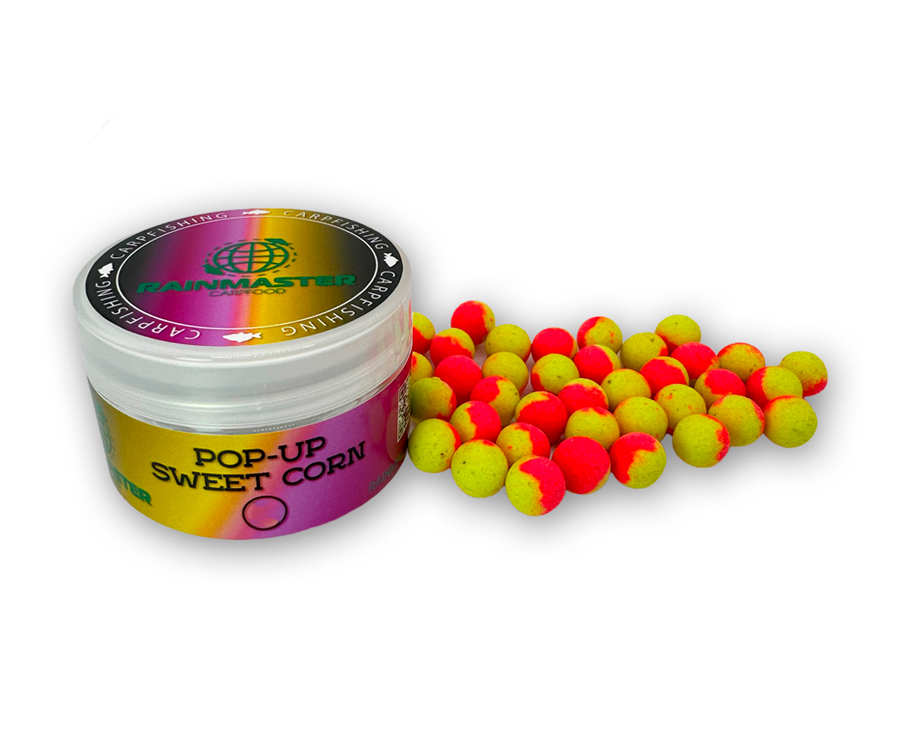 Rainmaster Pop-Up Sweet Corn – плаваючі бойли діаметром 8 мм. Аромат: солодка кукурудза. Їх створено за унікальною рецептурою, здобутою впродовж багатьох років на великій кількості змагань із коропової ловлі під час максимального пресингу на рибу. Бойли Rainmaster Pop-Up виготовлено з найякісніших інгредієнтів, які не шкодять навколишньому середовищу і смакують рибі. Ідеально підходять для класичної коропової та флет-фідерної ловлі. Rainmaster Pop-Up мають оригінальний колір, смак і запах, який швидко поширюється у воді, приваблюючи рибу. Випускаються в зручній розфасовці.