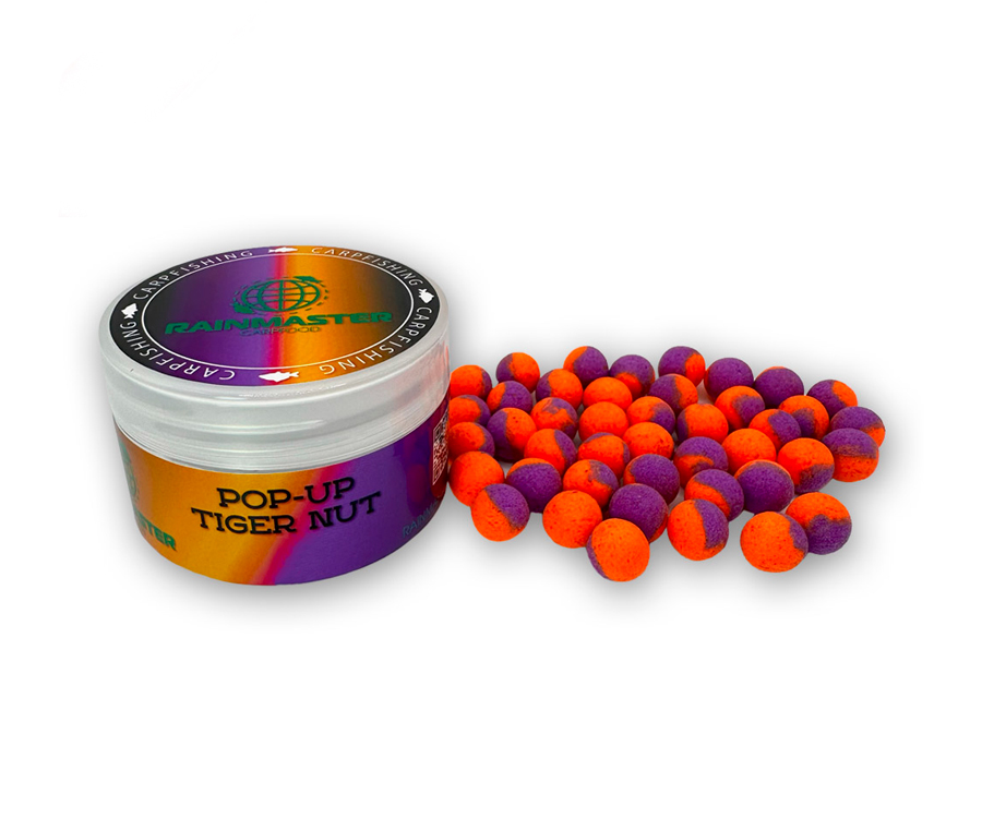 Rainmaster Pop-Up Tiger Nut – плаваючі бойли діаметром 10 мм. Аромат: тигровий горіх. Їх створено за унікальною рецептурою, здобутою впродовж багатьох років на великій кількості змагань із коропової ловлі під час максимального пресингу на рибу. Бойли Rainmaster Pop-Up виготовлено з найякісніших інгредієнтів, які не шкодять навколишньому середовищу і смакують рибі. Ідеально підходять для класичної коропової та флет-фідерної ловлі. Rainmaster Pop-Up мають оригінальний колір, смак і запах, який швидко поширюється у воді, приваблюючи рибу. Випускаються в зручній розфасовці.