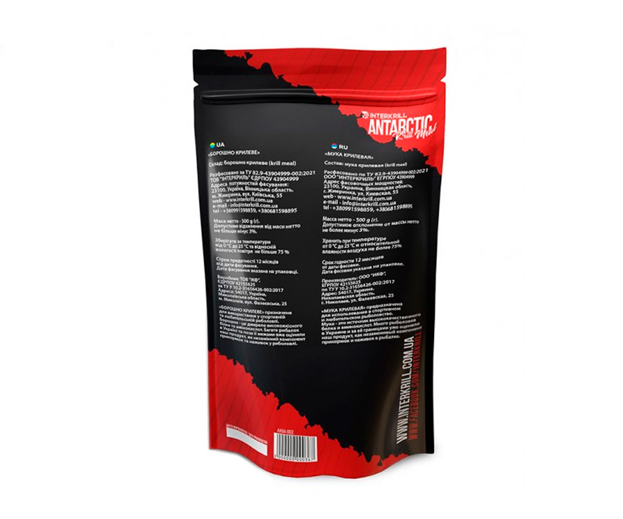 Крилеве борошно — це джерело високоякісного білку і амінокислот, які мають тваринне походження. Борошно є незамінним компонентом прикорму і наживок, і багато рибаків вже оцінили її ефективність. Роблять борошно з антарктичного криля, він відноситься до ракоподібних і мешкає в антарктичних водах. Криль переробляють у борошно прямо на судні. Крилеве борошно є винятковим аттрактантом, оскільки має яскравий колір і специфічно різкий запах, який відчувається здалека і подобається рибі. У складі борошна величезна кількість вітамінів, мінералів і протеїну. Крилеве борошно можна використати для підвищення привабливості будь-якої приманки. Особливий інтерес продукт викликає у наступних видів риб : короп, карась, білий Амур, лящ, плітка та ін. У борошна з криля є вигідні фізичні особливості — продукт дозволяє зробити наживку грубішою, а також підвищує її поширення, якщо додавати в потрібній кількості. Крилеве борошно є дуже легким інгредієнтом.
