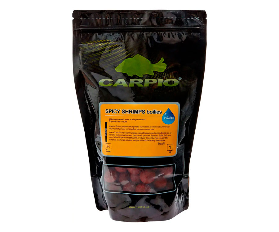 Бойли Carpio SpicyShrimps – ефективні розчинні бойли, які призначено для використання в ролі насадки чи прикормки під час ловлі коропа. Основними інгредієнтами продукту є подрібнене насіння зернових і злакових культур, борошно криля, Робін Ред, спеції, комплекси вітамінів, мінералів, мікроелементів та інших поживних компонентів корисних для здоров'я риби. Додавання смакових складових та ароматів підсилює привабливість бойлів Carpio SpicyShrimps для риби. Серед основних переваг Carpio SpicyShrimps головним є їхня здатність не перенасичувати рибу та одночасно виконувати роль прикормки та насадки. Ви збираєтеся влітку на коротку риболовну сесію і не маєте часу на вмовляння коропа? Ця приманка саме для таких випадків. Насичений аромат спецій і криля у поєднанні з міксом секретних інгредієнтів – це саме те, що зробить результат!