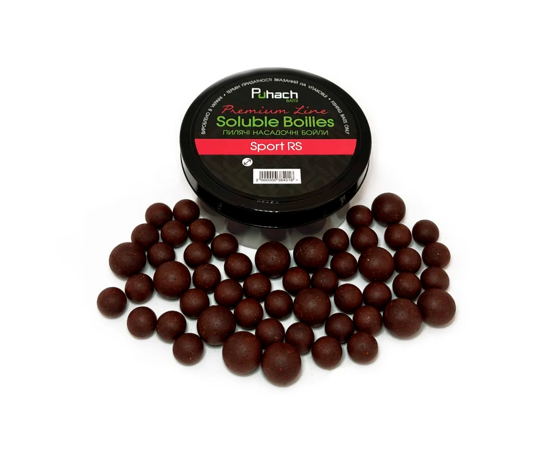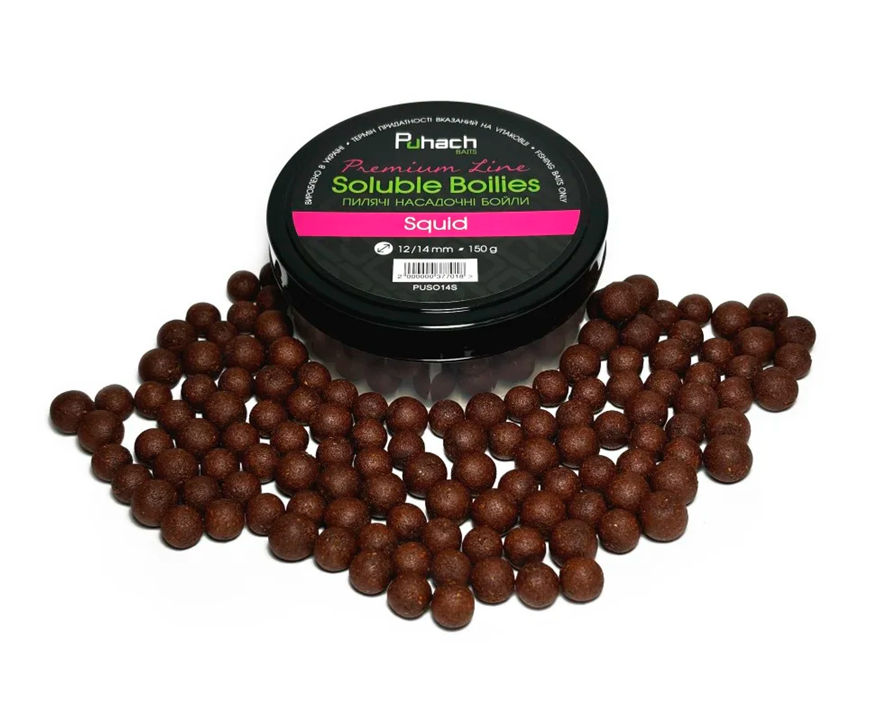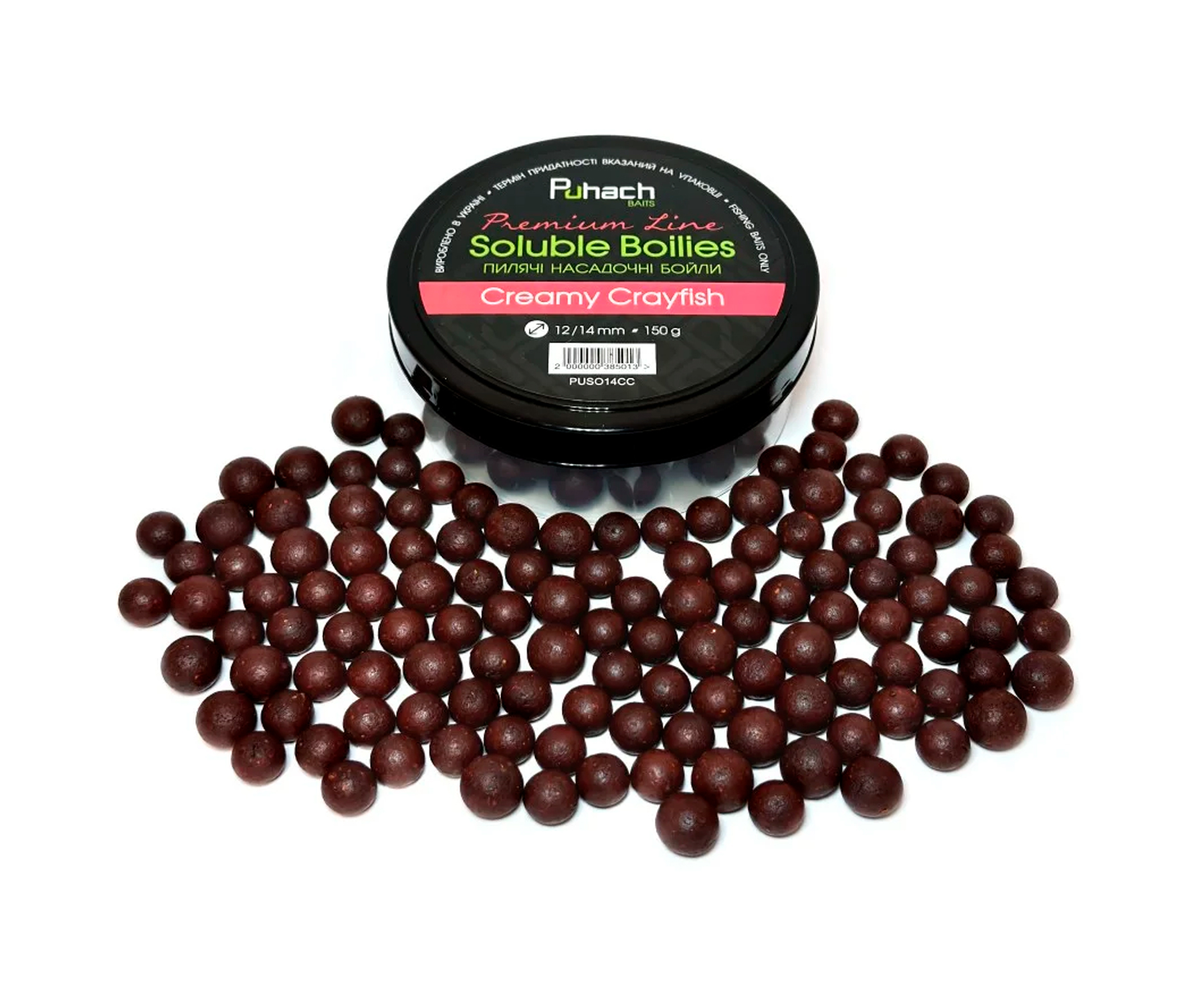 Puhach Baits Premium Line Soluble Boilies – насадочні пилячі бойли найвищої якості для ловлі великої риби. Розроблені чемпіоном України та відомим риболовом-спортсменом Олексієм Пугачем з урахуванням досвіду українських і міжнародних змагань. Випускаються у двох комбінаціях розмірів: 14 мм та 20 мм. У герметичній баночці 150 г продукту. Бойли Puhach Baits Premium Line Soluble підходять для ловлі як вдень, так і вночі. Не розвалюються під час насаджування за допомогою товстої голки. Ідеальні для ловлі коропа, амура та іншої великої риби. Приманки виготовлено з використанням високоякісних інгредієнтів, що постачають із європейського ринку: зернових, стимуляторів апетиту, ароматизаторів, підсолоджувачів, харчових барвників і бетаїну. У серії присутні класичні та фруктові запахи, солодкі аромати і спеції, особливо привабливі для трофейної риби. Бойли Puhach Premium Line Soluble Boilies абсолютно нешкідливі для риби та інших підводних мешканців. Їх випускають з оригінальним кольором, смаком і запахом, що швидко поширюється у воді та чудово приваблює рибу в місце ловлі. Рекомендовано як для класичної коропової, так і для флет-фідерної ловлі.