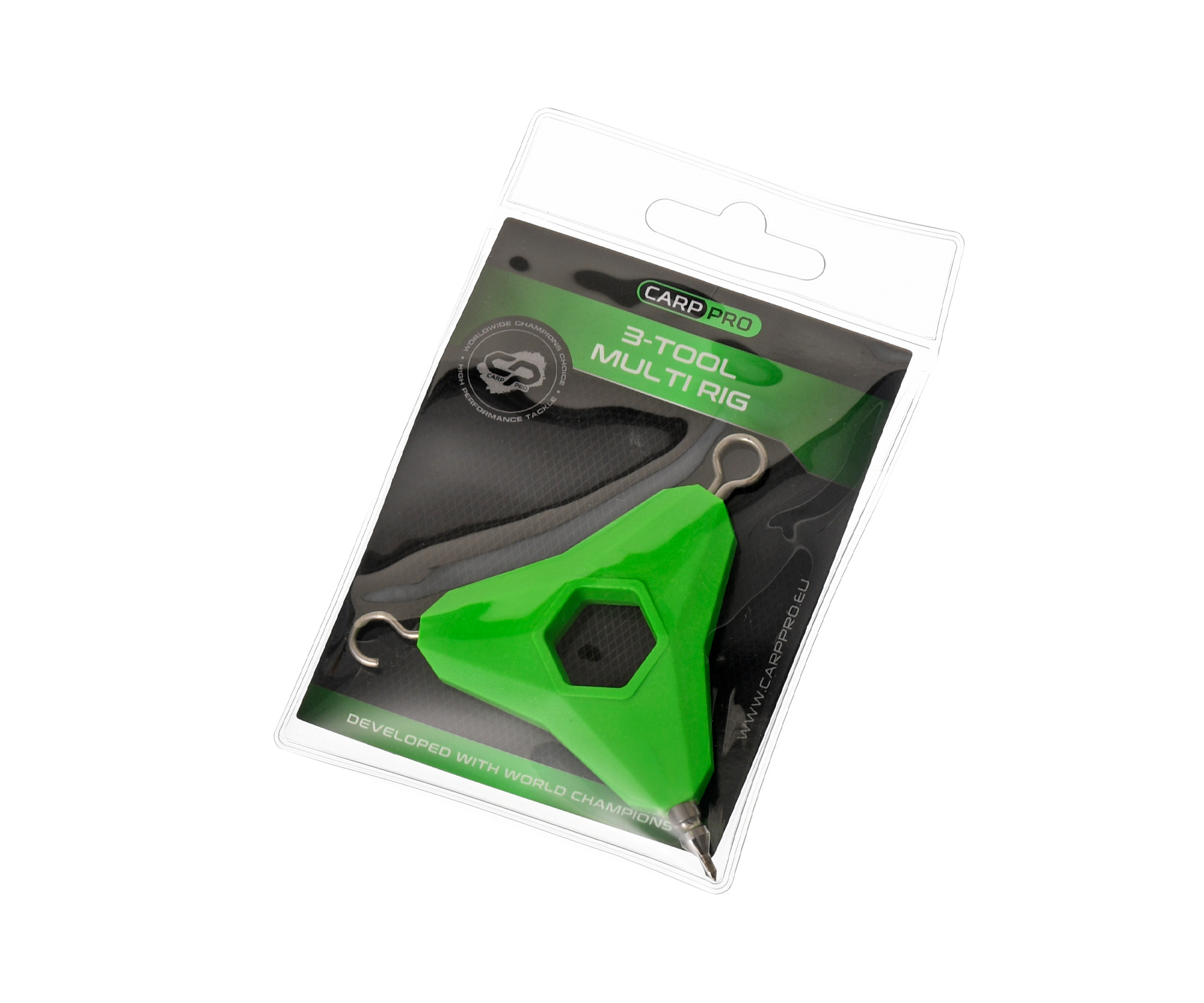 Carp Pro 3-Tool Multi Rig – зручний багатофункціональний мультиінструмент, що призначений для виготовлення коропових оснасток та поєднує в собі три інструменти, конче необхідних кожному прихильнику ловлі коропа. До його складу входять: петля для затягування гачків, гачок для затягування вертлюжків та вістря для виготовлення оснастки D-Rig. Мультиінструмент Carp Pro 3-Tool Multi Rig виготовлено з високоякісного пластику та нержавіючої сталі. Він зручний у роботі, а завдяки яскраво-зеленому кольору рукояті не загубиться в траві або поміж інших ваших інструментів.