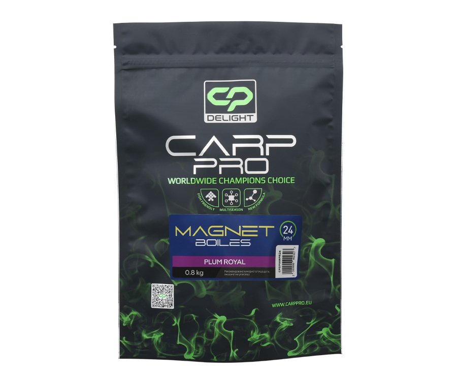 Бойли Carp Pro Delight Magnet Boiles – варені прикормочні бойли, які вироблено з використанням високоякісних інгредієнтів, що постачаються з європейського ринку. Це зернові, стимулятори апетиту, ароматизатори, підсолоджувачі, бетаїн, корисні для коропа комплекси мінералів і вітамінів. Серію розроблено експертами компанії Carp Pro спільно з відомим спортсменом Олексієм Пугачем. Бойли мають унікальне поєднання кольорів, смаків та ароматів, що швидко поширюються у воді та приваблюють коропа. Delight Magnet Boiles рекомендовано як для класичної, так і для спортивної ловлі коропа. Виробляються у зручному фасуванні та в найбільш популярних розмірах.