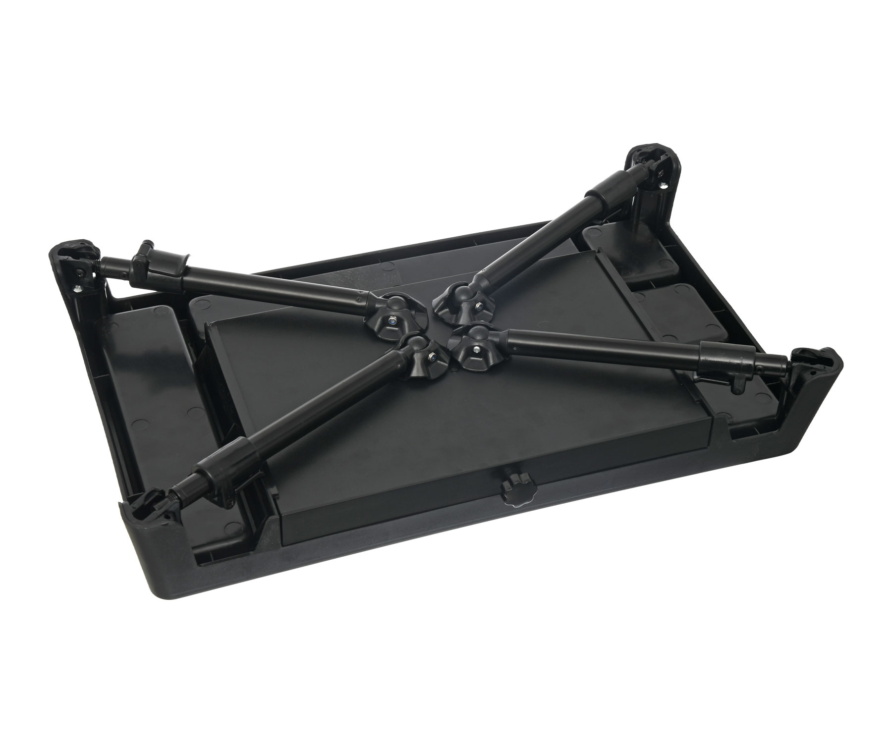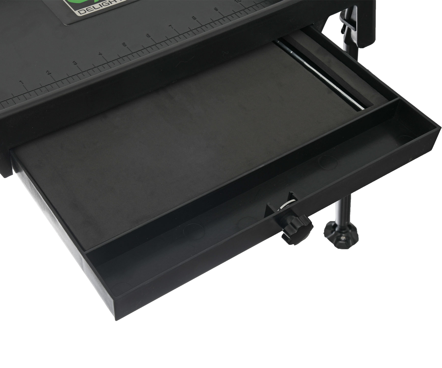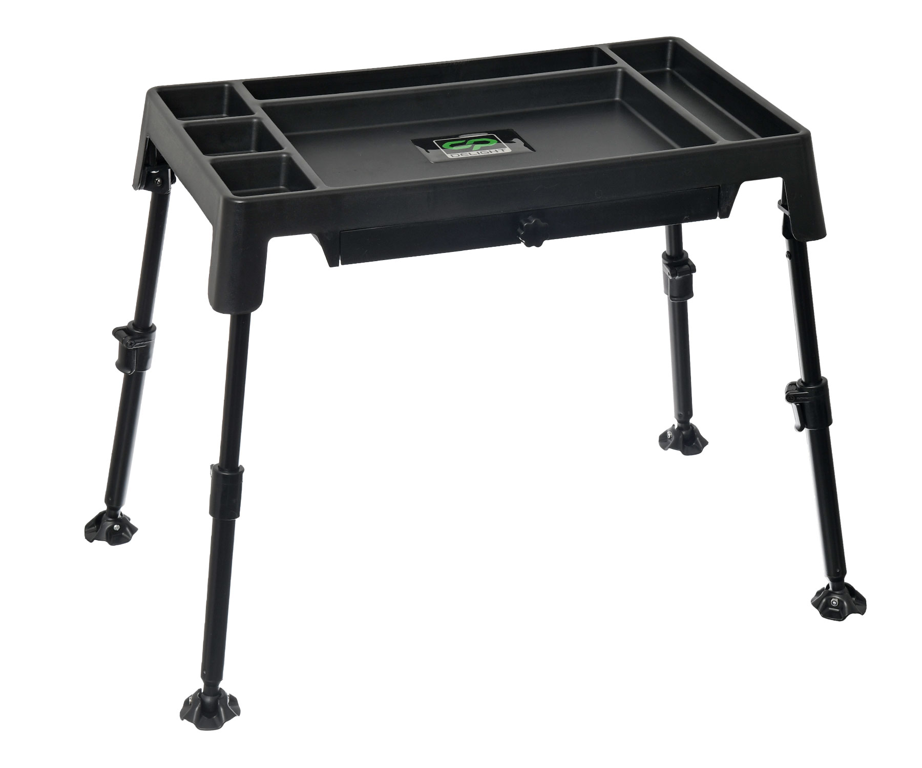 Carp Pro Delight Bivvy Table With a Rig Box – складаний багатофункціональний монтажний стіл, розроблений спеціально для коропової риболовлі. Монтажний Carp Pro Delight Bivvy Table With a Rig Box призначено для підготовки снастей, виготовлення монтажів та оснасток під час риболовлі. Стільницю з високоміцного пластику розділено на 6 відділень із високими бортами, що забезпечує зручність і максимальну ефективність: кожен предмет лежить на своєму місці і не скочується зі стола. На поверхню основного відділення нанесено лінійку для вимірювання довжини оснасток із шкалою в сантиметрах та дюймах. Чотири регульовані за висотою ніжки мають телескопічну конструкцію та оснащені грязьовими п'ятами на шарнірах, що дає змогу встановити стіл практично на будь-якому рельєфі та м'якому ґрунті. Під стільницею розташовано висувну полицю, що має відсік для інструментів і велику зручну повідочницю із знімним елементом ЕВА. Полиця від самовідкривання фіксується спеціальною защібкою. За необхідності повідочницю взагалі можна прибрати і користуватися самою полицею. Каркас столу виготовлено з легкого та міцного пластику, що значно зменшує вагу Delight Bivvy Table With a Rig Box, а його складана конструкція забезпечує максимальну зручність під час зберігання і транспортування.