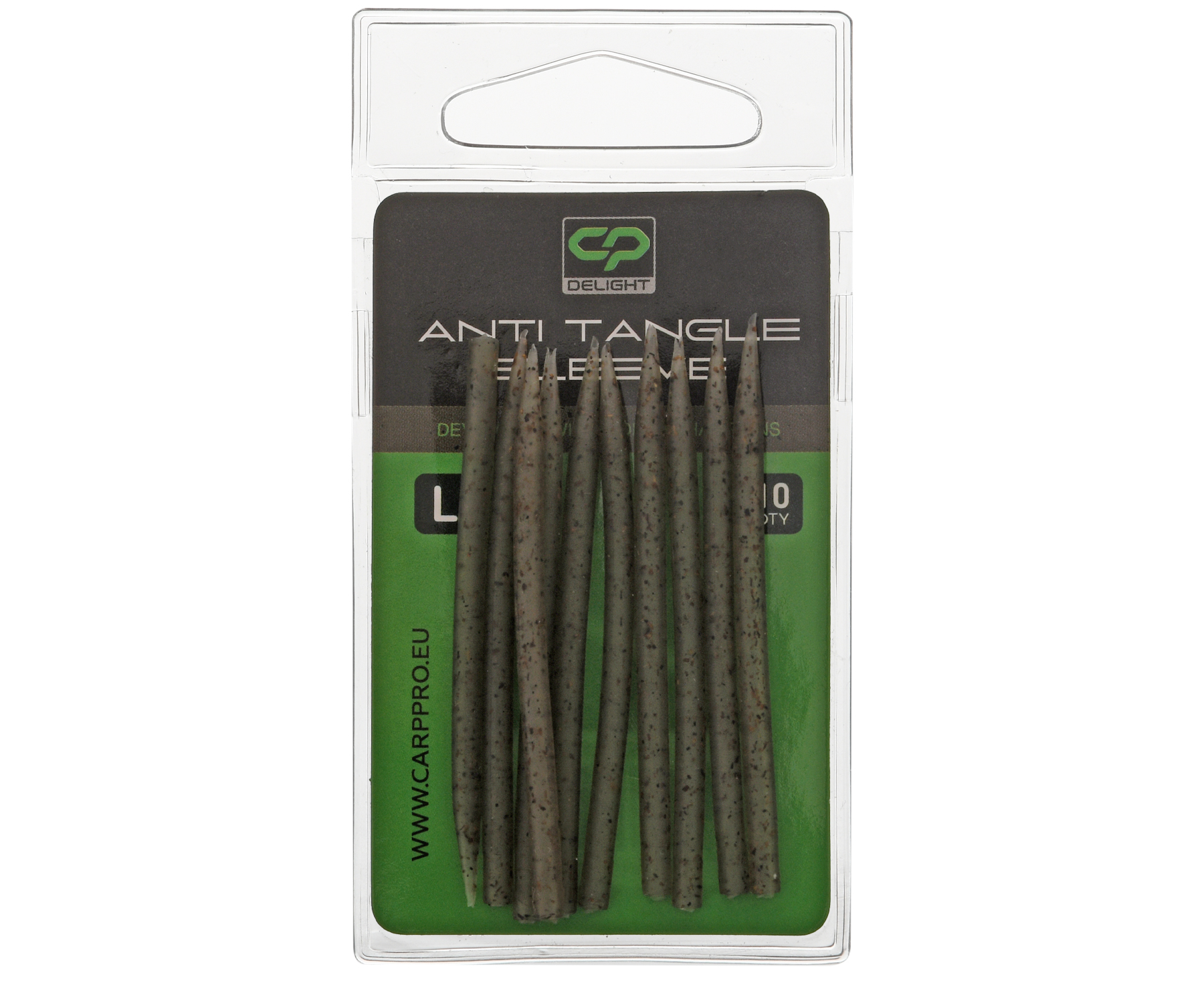Carp Pro Delight Anti Tangle Sleeve – конусний протизакручувач повідця, який виготовлено з міцної еластичної гуми. Застосовується в більшості коропових монтажів для запобігання заплутуванню повідця під час закидання. Конусні протизакручувачі Carp Pro Delight Anti Tangle Sleeve доступні в довжинах S (14 мм), M (32 мм) та L (55 мм), тому кожен риболов може легко підібрати необхідну йому модель. Протизакручувачі S та M ідеально підходять для порівняно коротких повідців, а L – для довгих повідців та ловлі на зіг-риг. Завдяки забарвленню camo конусний протизакручувач Carp Pro Delight Anti Tangle Sleeve чудово маскується поміж водної рослинності на будь-якому дні.