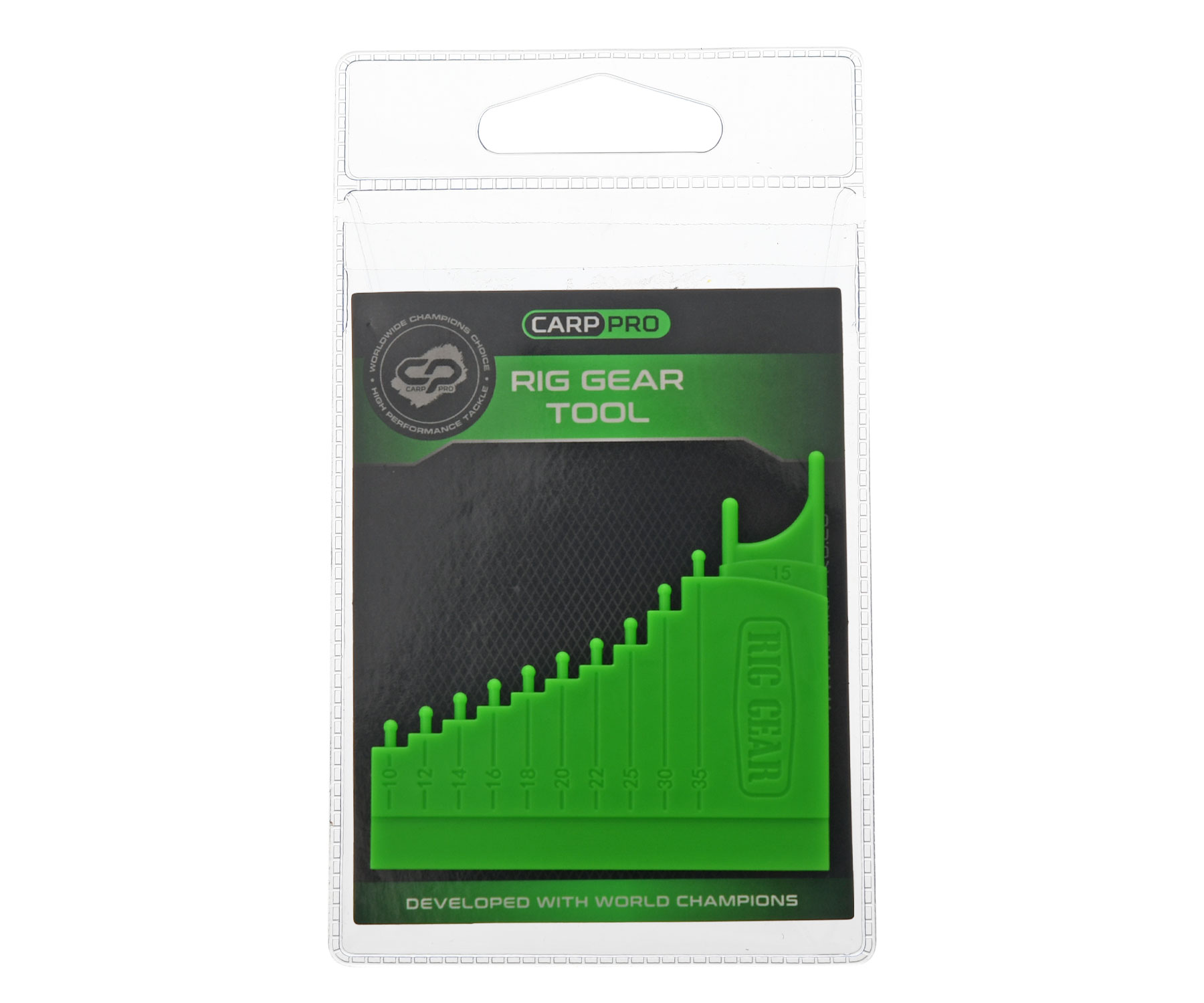 Carp Pro Rig Gear Tool – ідеальний інструмент для виготовлення повідців, який позбавляє необхідності одягати приманки на волос, що пришвидшує його виготовлення. Rig Gear Tool дає змогу щоразу точно вимірювати довжину волоса та має маркування вимірювання від 10 до 40 мм з обох боків. Інструмент Carp Pro Rig Gear Tool також дає змогу точно створити петлю завдовжки 15 мм. Він виготовлений із міцного пластику, зручний у роботі, а завдяки яскраво-зеленому кольору не загубиться в траві або поміж інших інструментів.