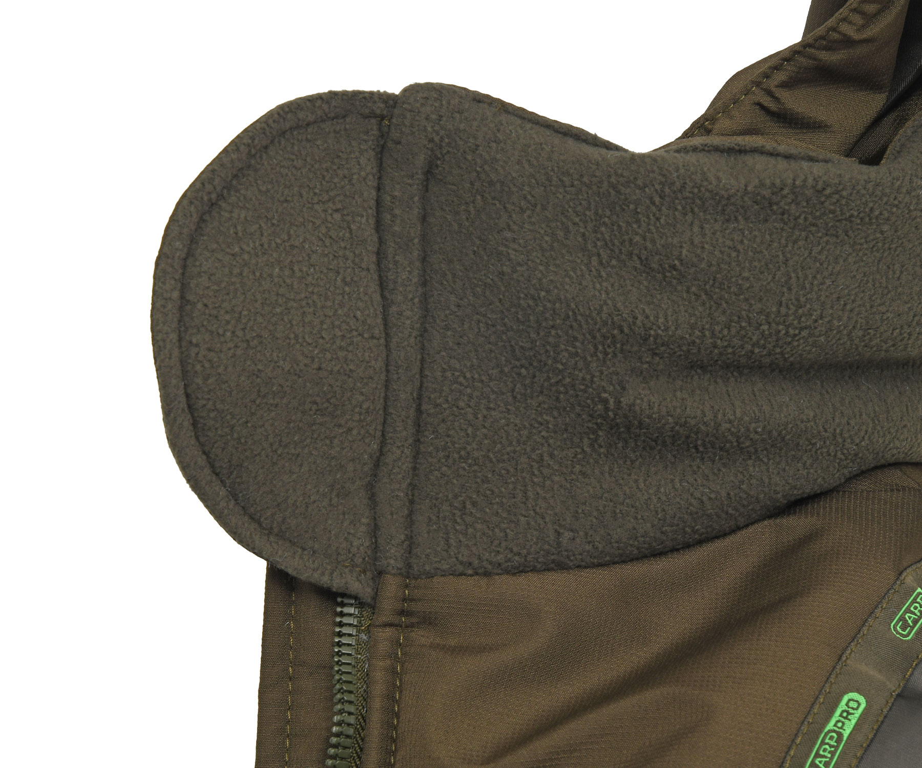 Куртку костюма Carp Pro Warm Suit Membrane вироблено в сучасному стильному дизайні Carp Pro. Вона має надійну основну блискавку, яку прикриває клапан на липучках. У куртці з боків є дві зовнішні утеплені кишені з блискавками й одна внутрішня кишеня на липучці – для цінних речей та документів. Краї рукавів мають утяжки на липучці. Також передбачено зручне утягування низу куртки. Високий зручний комір куртки вдало поєднується з глибоким капюшоном на підкладці, який чудово захищає голову від вітру та водяних бризок. Передбачено регулювання капюшону на липучці в потиличній частині та затяжки-фіксатори з боків.