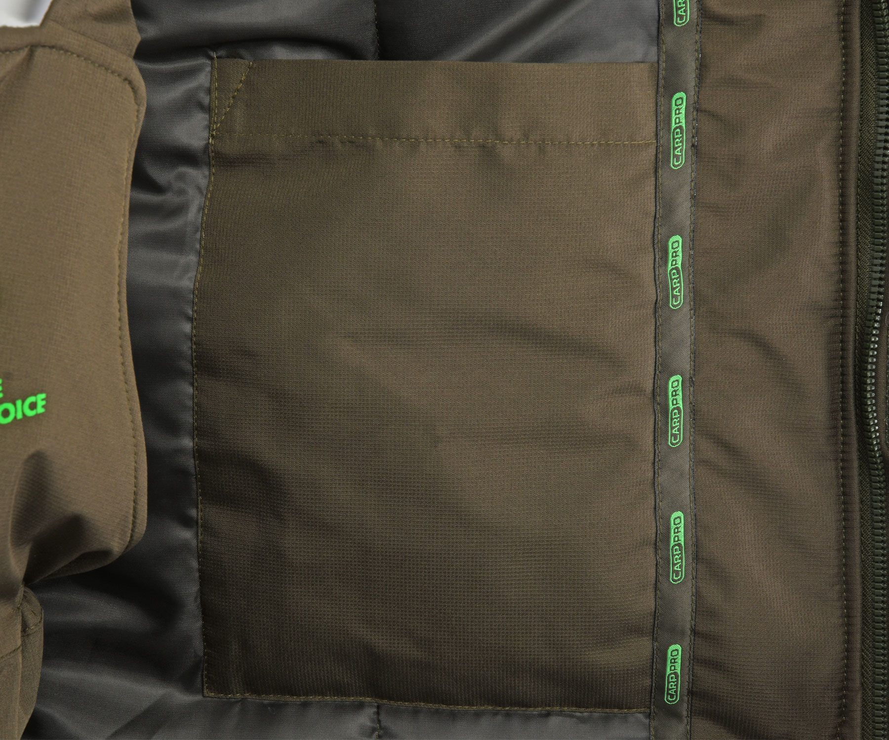 Куртку костюма Carp Pro Warm Suit Membrane вироблено в сучасному стильному дизайні Carp Pro. Вона має надійну основну блискавку, яку прикриває клапан на липучках. У куртці з боків є дві зовнішні утеплені кишені з блискавками й одна внутрішня кишеня на липучці – для цінних речей та документів. Краї рукавів мають утяжки на липучці. Також передбачено зручне утягування низу куртки. Високий зручний комір куртки вдало поєднується з глибоким капюшоном на підкладці, який чудово захищає голову від вітру та водяних бризок. Передбачено регулювання капюшону на липучці в потиличній частині та затяжки-фіксатори з боків.