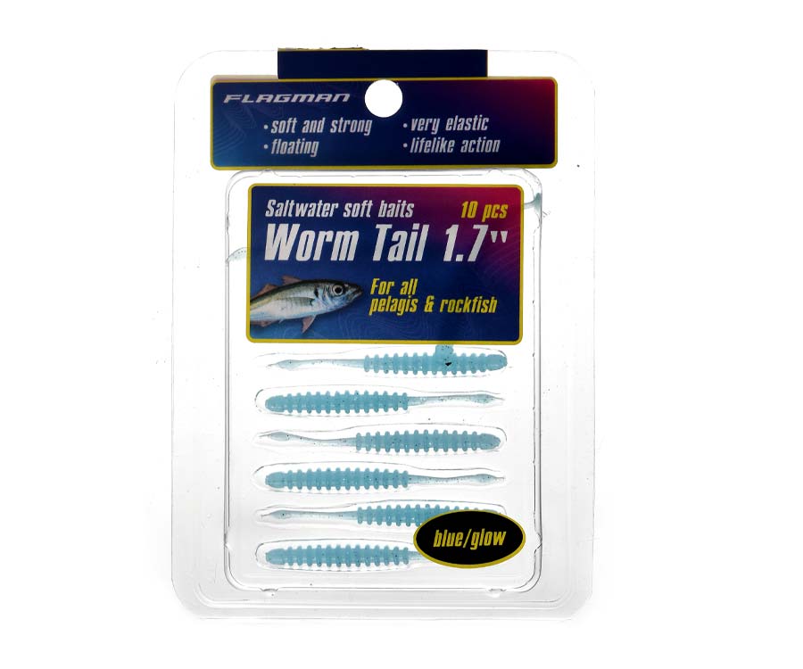 Flagman Worm Tail – уловиста пасивна приманка, яку розроблено для морської прибережної ловлі легким джигом. Щільний і міцний матеріал, з якого виготовлено приманку Flagman Worm Tail, вирізняється високою еластичністю. Worm Tail має гнучке видовжене тіло ребристої конструкції та тонкий хвостик із невеликим стовщенням на кінці. Ця приманка дуже ефективна як у стоячій воді, так і на течії. Її поведінка здебільшого залежить від дій риболова: вона чудово показує себе як на активних та ривкових проведеннях у середніх шарах води, так і на повільних джигових анімаціях біля дна. Легкі рухи й вібрації хвостика, оснащеного невеликим стовщенням, і турбулентність від ребристого тіла додатково мотивують хижака, а іноді й мирну рибу, до клювання. Визначальна відмінність приманок Flagman Worm Tail від прісноводних аналогів – яскраві прозорі забарвлення, що довгий час фосфорицюють таким же яскравим кольором у темряві й сутінках.