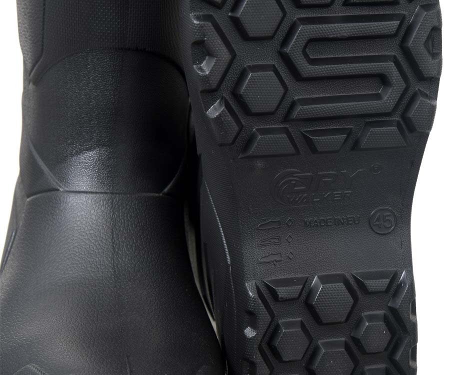 Сучасні, всесезонні і універсальні гумові чоботи Dry Walker. Вони виготовлені з міцного матеріалу ЄВА(этіленвінілацетат), що забезпечує відповідну легкість і повну водонепроникність. Дизайн гумових чобіт грунтований на новітніх технологіях, завдяки чому вони ідеально підходять для багатьох видів діяльності. Їх можна з успіхом використовувати під час риболовлі на річці, роботі в саду, на фермі і при проведенні будівельних робіт. Гумові чоботи мають сертифікат B — BŻ — 6071-0091-18 — C, що дозволяє використовувати їх на підприємствах харчової промисловості. Взуття оснащене нековзною повстяною устілкою, яка адаптується до стилю ходьби і підтримує потрібну температуру усередині, забезпечуючи винятковий комфорт під час використання. Товсті стінки використовуваного взуття роблять вирішальний вплив на захисні властивості. На п'яту накладений спеціальний килимок, що поглинає вібрації.