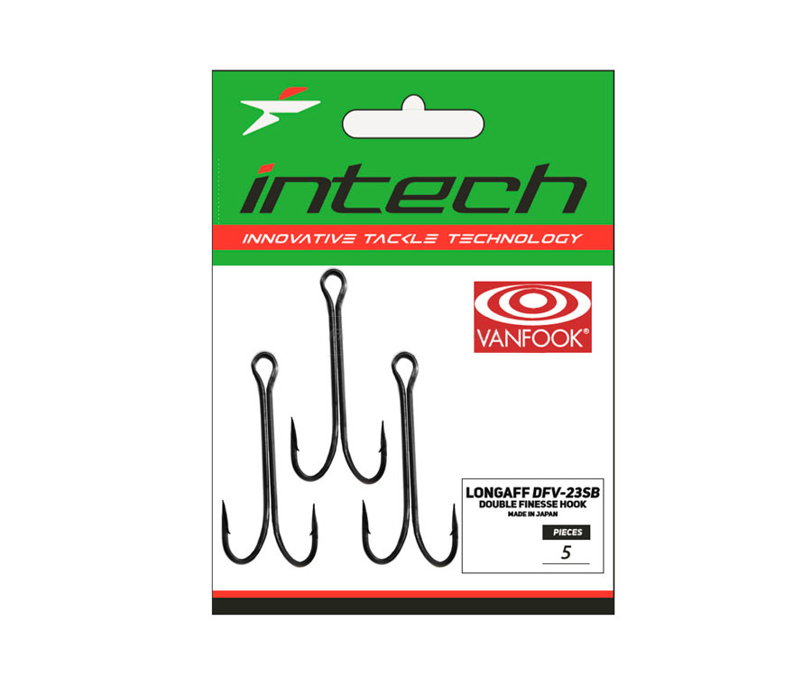 Intech Longaff DFV-23SB - подвійний гачок з подовженою цівкою, виготовлений для компанії Intech на японському заводі Vanfook - лідера у виробництві рибальських гачків. Двійник з довгою цівкою Longaff DFV-23SB виготовлений із дроту середньої товщини та призначений для оснащення м'яких пластикових приманок подовженої форми. Жало гачка добре просікає жорстку риб'ящу пащу, стійко до механічних пошкоджень, відмінно тримає заточування після контакту з твердими підводними перешкодами: корчами, чагарником, черепашником. Захисне покриття має чорний матовий колір.