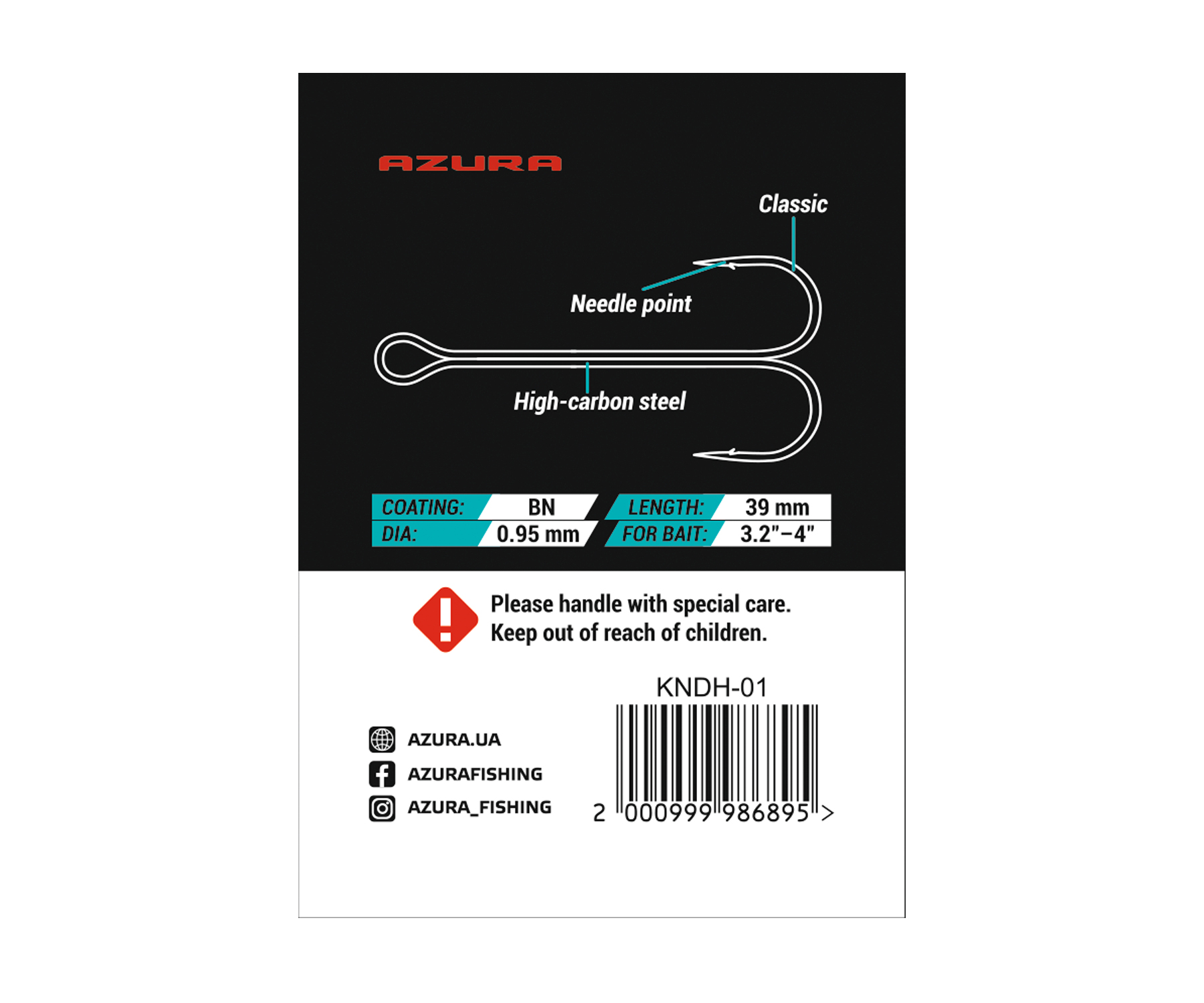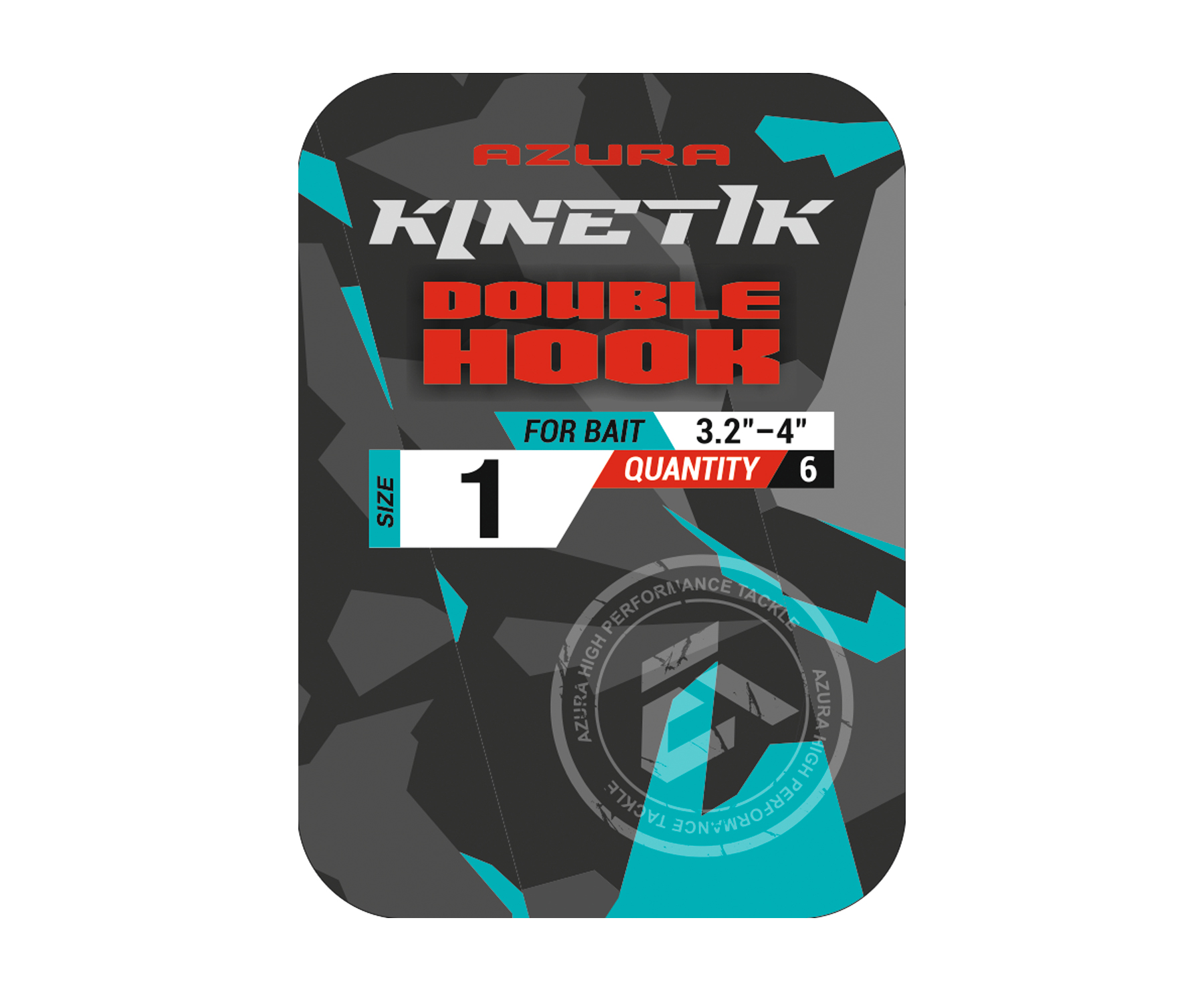 Azura Kinetik Double Hook – серія високоякісних подвійних гачків, які призначено для використання в шарнірних та інших спінінгових монтажах. Гачки виготовлено з високовуглецевого сталевого дроту. Вони мають високу надійність і міцність на розгинання. Для гачків Azura Kinetik Double Hook характерні стандартна довжина цівки, класична форма піддіву, надгостре жало із заточуванням Needle Point, що гарантує надійне засікання риби, акуратна борідка та високоякісне антикорозійне покриття Black Nickel. Двійники Azura Kinetik ідеально підходять для оснащення більшості м'яких пластикових приманок найрізноманітніших форм. Широкий розмірний ряд Azura Kinetik Double Hook дає змогу підібрати оптимальний за розміром гачок практично під будь-яку м'яку приманку з розміром від 2 до 5 дюймів.