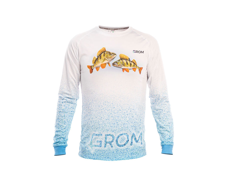 Джерсі для рибалки із зображенням окунів. Малюнок повністю унікальний, виконаний на замовлення компанії GROM. Джерсі має світлий колір з яскравими акцентами на малюнку на грудях та графічному принті в нижній частині тіла та рукавів. Це робить її строгою та стильною, в той же час яскравою та індивідуальною. Цей дизайн створено для фанатів витонченої ловлі окуня. Виготовлено кофту з дихаючої спортивної тканини Milk Silk. Це 100% поліестер. Переваги: — тягнеться у чотирьох напрямках та дуже комфортна до тіла; — тканина має рівень захисту від ультрафіолету UPF 50+; — кофта дуже швидко сохне; — зображення наноситься методом сублімації та не втрачає колір після прання або під впливом сонячного проміння. Прати у режимі «синтетика» при температурі не вище за 40 градусів або ручне прання. Прасувати на температурі не вище за 150 градусів або у режимі «шовк» чи «синтетика». Якщо сушити кофту у рівному положенні, то складок не виникатиме і прасування не буде потрібно.