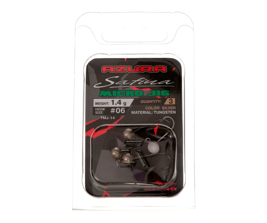 Azura Safina Tungsten Micro Jig – вольфрамова джиг-головка для мікроджигу. Цю джиг-головку було спеціально створено для любителів ловлі неохочої до клювань або запресованої риби найменшими приманками. Переваги: міцний гачок класичної форми, надгостре жало, здатне витримувати винятково велику кількість клювань і спеціальна форма тіла тягарця, яка дозволяє якомога гармонічніше поєднати джиг-головку Azura Safina Tungsten Micro Jig із приманкою, візуально утворивши з нею суцільний харчовий об’єкт.