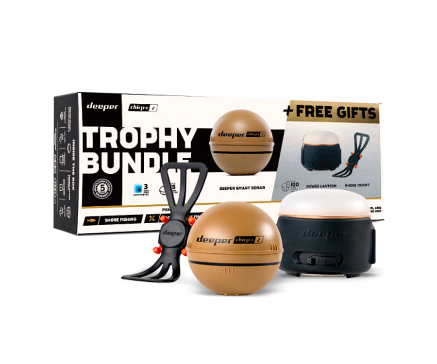 Deeper Smart Sonar CHIRP+ 2 Trophy Bundle 2022 with Power Lantern and Phone Holder – трофейний набір від компанії Deeper! У комплект Deeper Trophy Bundle входить флагманський продукт компанії ехолот Deeper CHIRP+ 2.0, а також потужний ліхтар-повербанк Deeper Lantern і кріплення для смартфона на вудлище Deeper Smartphone Mount.