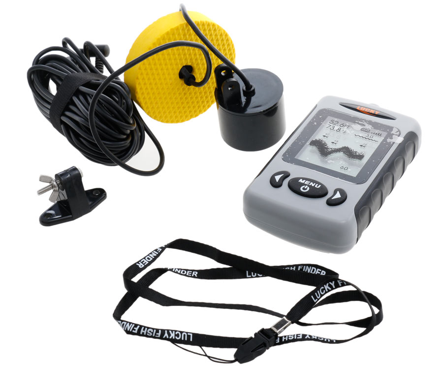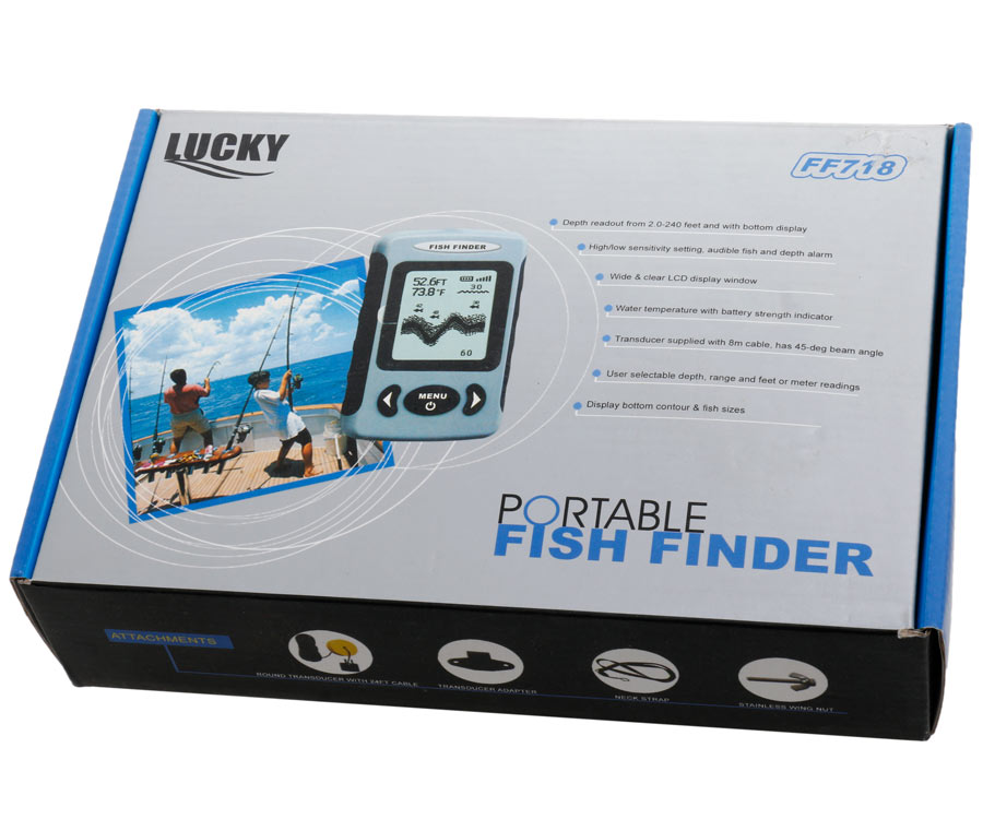 Дротовий ехолот Lucky Fish Finder FF718 надасть вам всю інформацію, необхідну для успішного лову незалежно від пори року. На зимовій риболовлі він без проблем працює при температурі -20 ° C, а спеціальний поплавець на дроті надійно утримує датчик в лунці. Будучи легким і компактним, даний прилад легко вміщується у внутрішню кишеню куртки, або кріпиться на шийному ремінці, що входить в комплект. Також датчик ехолота Lucky FF718 можна встановити на струбцину. Ехолот обладнаний чорно-білим екраном зі світлодіодним білим підсвічуванням, що дозволяє використовувати ехолот в умовах поганої видимості. Прилад промальовує рельєф дна, а також відображає рибу різних розмірів, подає звуковий сигнал при її виявленні. Ехолот оснащений вбудованим датчиком температури.