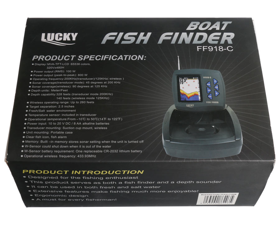 Ехолот Lucky FF918-100W має великий екран. У комплекті 2 датчики: один із дротом, другий — бездротовий. Універсальний ехолот Lucky FF918-100W можна використовувати як для риболовлі з берега, так і для човна. Ця модель ехолота Lucky може працювати від джерела постійного струму з напругою 12 вольт, так і від 8 батарей ААА.