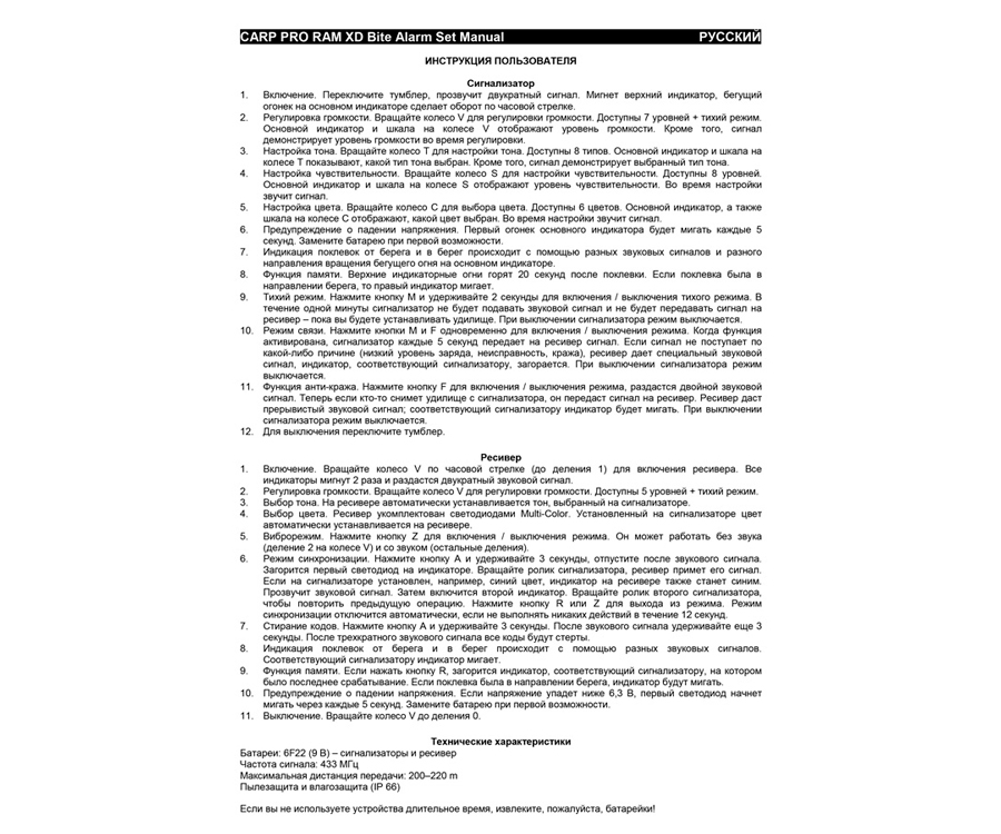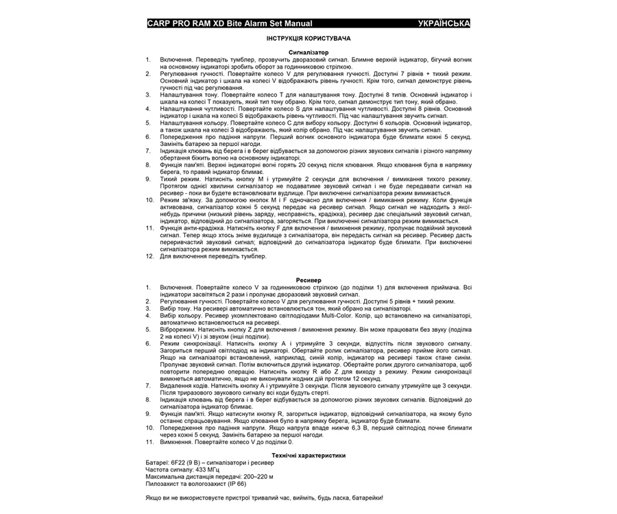 Увімкнення/вимкнення сигналізатора здійснюється тумблером, а керування функціями – регуляторами-потенціометрами. Сигналізатор має 7 рівнів гучності + тихий режим, 8 режимів налаштування тональності, 8 режимів чутливості та 6 варіантів налаштування кольору світлодіодного індикатора. На передній панелі розташовано 4 регулятори (коліщатка), за допомогою яких здійснюються регулювання звуку, тональності, чутливості, вибір кольору індикатора. Світлодіоди-індикатори дуже яскраві, їх добре видно як вночі, так і вдень. Крім двох верхніх світлодіодів, передбачено великий основний індикатор із 8 світлодіодів, що розташовані по колу. Індикація клювання від берега та в берег відбувається за допомогою різних звукових сигналів і різного напрямку обертання світла, що біжить, на основному індикаторі. Передбачено функцію попередження про низький рівень заряду елемента живлення: під час включення сигналізатора основний індикатор показує рівень заряду кількістю працюючих світлодіодів. Сигналізатор має функцію пам'яті – верхні індикаторні вогні горять 20 секунд після клювання. Якщо клювання було в напрямку берега, то блимає правий індикатор. Крім того, передбачено функції «Антикрадіжка», «Режим зв'язку», «Тихий режим». У «Тихому режимі» сигналізатор не подаватиме звуковий сигнал і не передаватиме сигнал на ресивер протягом однієї хвилини – доки ви встановлюватимете вудлище. Carp Pro RAM XD обладнано роз'ємом для підключення індикаторів клювання. Він має високий пило- та вологозахист – IP 66. Варіанти кольору сигналізатора: яскраво-фіолетовий, червоний, жовтий, синій, зелений, фіолетовий. Живлення здійснюється від 1 елементу 6F22 9V (Крона).