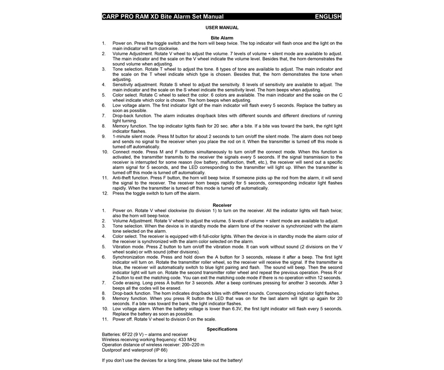 Увімкнення/вимкнення сигналізатора здійснюється тумблером, а керування функціями – регуляторами-потенціометрами. Сигналізатор має 7 рівнів гучності + тихий режим, 8 режимів налаштування тональності, 8 режимів чутливості та 6 варіантів налаштування кольору світлодіодного індикатора. На передній панелі розташовано 4 регулятори (коліщатка), за допомогою яких здійснюються регулювання звуку, тональності, чутливості, вибір кольору індикатора. Світлодіоди-індикатори дуже яскраві, їх добре видно як вночі, так і вдень. Крім двох верхніх світлодіодів, передбачено великий основний індикатор із 8 світлодіодів, що розташовані по колу. Індикація клювання від берега та в берег відбувається за допомогою різних звукових сигналів і різного напрямку обертання світла, що біжить, на основному індикаторі. Передбачено функцію попередження про низький рівень заряду елемента живлення: під час включення сигналізатора основний індикатор показує рівень заряду кількістю працюючих світлодіодів. Сигналізатор має функцію пам'яті – верхні індикаторні вогні горять 20 секунд після клювання. Якщо клювання було в напрямку берега, то блимає правий індикатор. Крім того, передбачено функції «Антикрадіжка», «Режим зв'язку», «Тихий режим». У «Тихому режимі» сигналізатор не подаватиме звуковий сигнал протягом однієї хвилини – доки ви встановлюватимете вудлище. Carp Pro RAM XD обладнано роз'ємом для підключення індикаторів клювання. Він має високий пило- та вологозахист – IP 66. Варіанти кольору сигналізатора: яскраво-фіолетовий, червоний, жовтий, синій, зелений, фіолетовий. Живлення здійснюється від 1 елементу 6F22 9V (Крона).