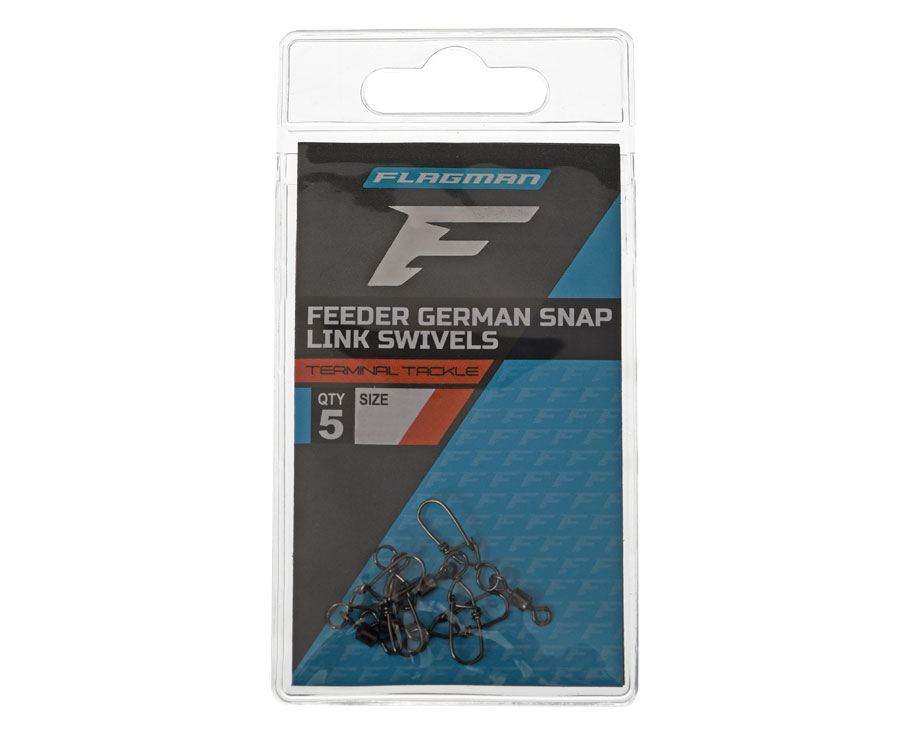 Flagman Feeder German Snap Link Swivels – надійні та витривалі вертлюги із застібками, які розроблено спеціально для використання у фідерних монтажах. Вертлюги обладнано посиленими застібками та виготовлено з високоякісних матеріалів. Feeder German Snap Link Swivels можна застосовувати для всіх типів фідерних монтажів у ролі вузла кріплення годівниці або грузила до оснастки. Посилена застібка дає змогу без остраху використовувати годівниці великої ваги. Залежно від умов риболовлі та ваги годівниць можна обрати один із доступних розмірів: S, М або L.