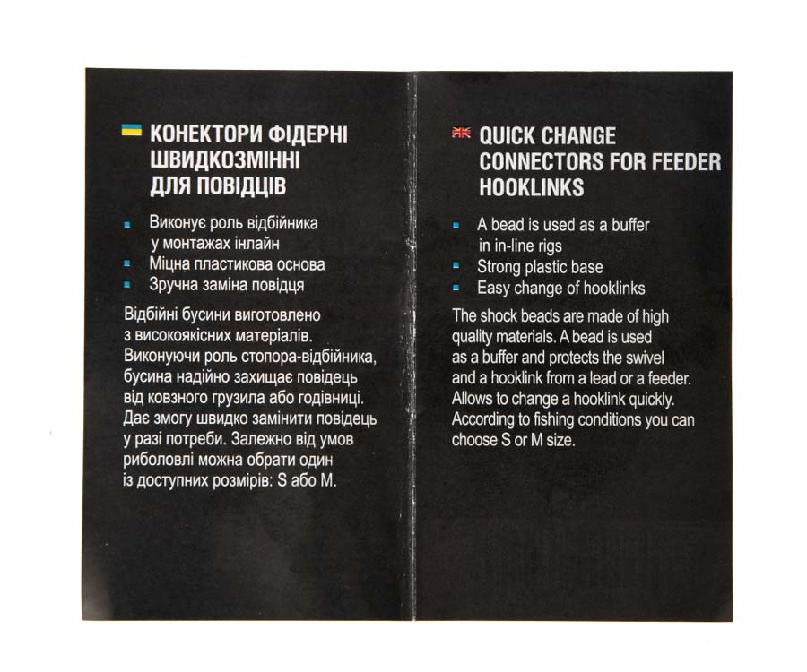 Фідерний конектор для повідця Flagman Quick Change Conectors – це найкраще рішення для швидкої заміни повідця у фідерній ловлі. Конектор Flagman Quick Change дає змогу оперативно поміняти повідець під час ловлі з ковзною оснасткою та одночасно виконує роль намистини-відбійника, об яку б'ється годівниця під час закидання. Намистини Flagman Quick Change Conectors виготовлено з високоякісних матеріалів. В упаковці 5 шт. Доступні розміри: M і S.