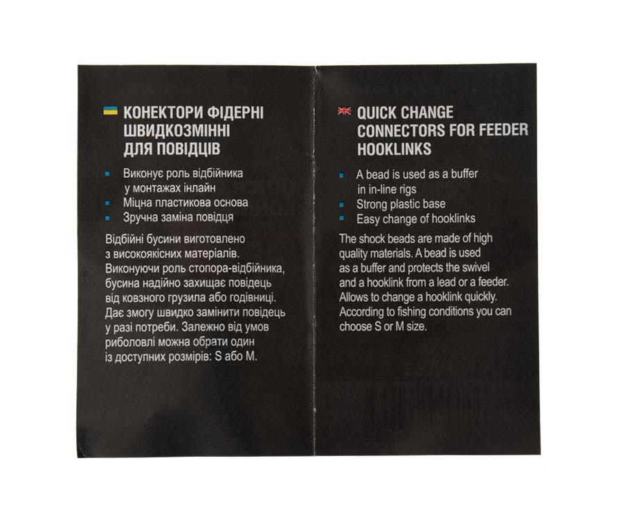 Фідерний конектор для повідця Flagman Quick Change Conectors – це найкраще рішення для швидкої заміни повідця у фідерній ловлі. Конектор Flagman Quick Change дає змогу оперативно поміняти повідець під час ловлі з ковзною оснасткою та одночасно виконує роль намистини-відбійника, об яку б'ється годівниця під час закидання. Намистини Flagman Quick Change Conectors виготовлено з високоякісних матеріалів. В упаковці 5 шт. Доступні розміри: M і S.