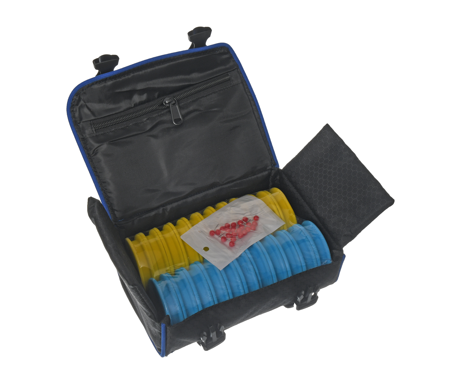 Flagman Armadale Rig Case – повідочниця, що виготовлена у формі компактної сумки, у якій розміщено 22 шпулі (йдуть у комплекті) для готових повідців та оснасток, а також 22 шпильки для їхньої фіксації. Шпулі діаметром 65 мм вироблені з EVA-матеріалу жовтого та синього кольору. Сумку повідочницю Flagman Armadale Rig Case виготовлено з міцного зносостійкого водонепроникного матеріалу Oxford 1200D. У її стінках розміщено вставки зі щільного синтетичного матеріалу, які забезпечують утримання форми та захищають вміст від пошкоджень. Сумка Armadale Rig Case закривається на дві пластикові застібки фастекс. На внутрішній стороні кришки вона має пласку кишеню на блискавці для зберігання гачків, вертлюжків та інших рибальських дрібничок. Повідочниця Armadale Rig Case має сучасний стильний вигляд та обладнана зручною ручкою для перенесення.