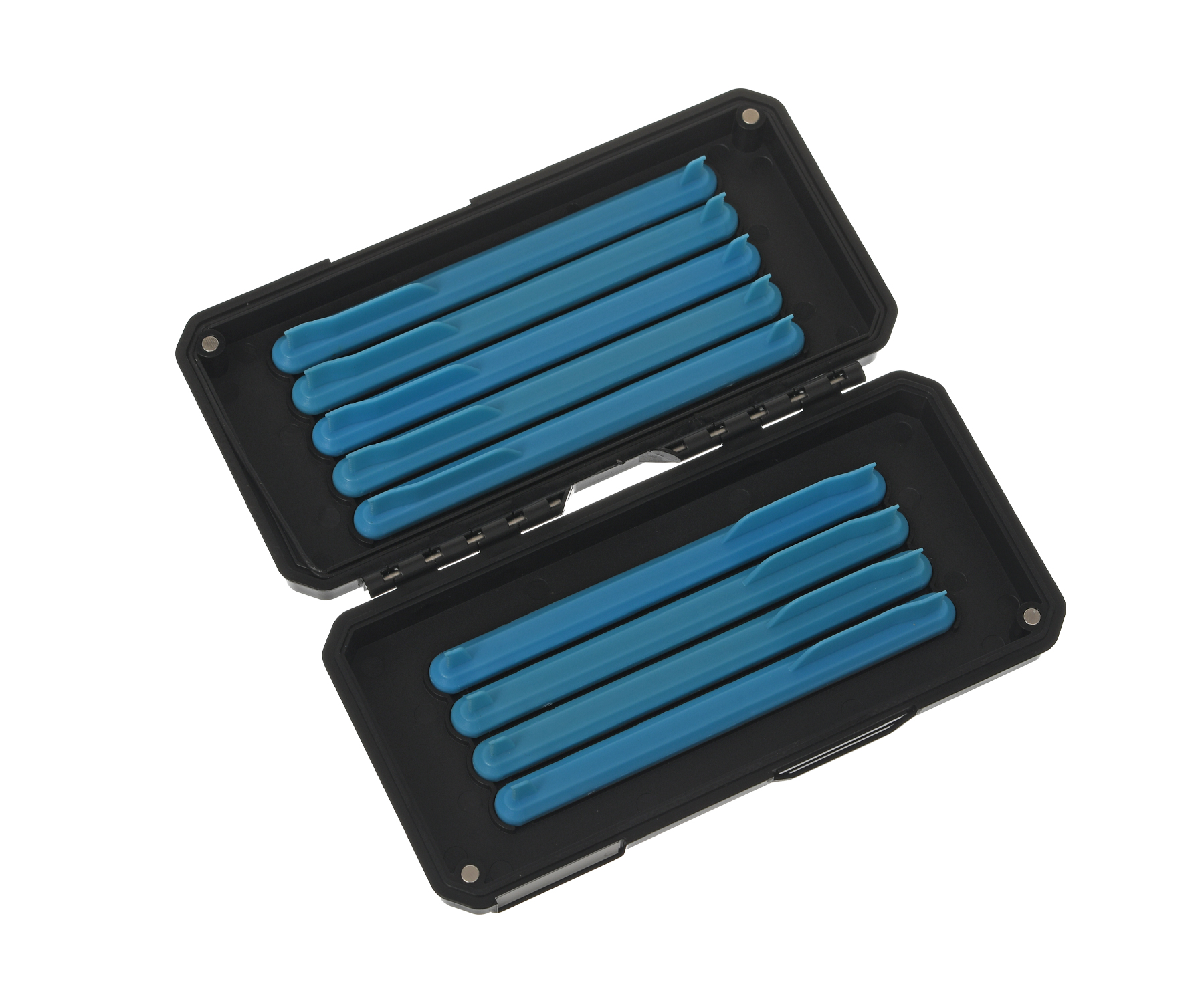 Повідочниця Flagman Tregaron Hooklength Box with Rig Sticks S – зручна та компактна повідочниця, яку виготовлено з легкого міцного пластику. Корпус щільно закривається за допомогою надійного магнітного замка із 4 магнітами. По периметру повідочниці розміщено ущільнювальну гумову вставку, яка захищає вміст від проникнення небажаної вологи та пилу. Flagman Tregaron Hooklength Box with Rig Sticks S комплектується 9 магнітними стіками завдовжки 10 см (4") кожен, що робить їх взаємозамінними. Повідочниця Tregaron Hooklength Box with Rig Sticks має компактні розміри й може зберігатися в риболовних сумках, станціях, платформах та ящиках. Розміри (ДхШхВ): 151х78х28 мм.
