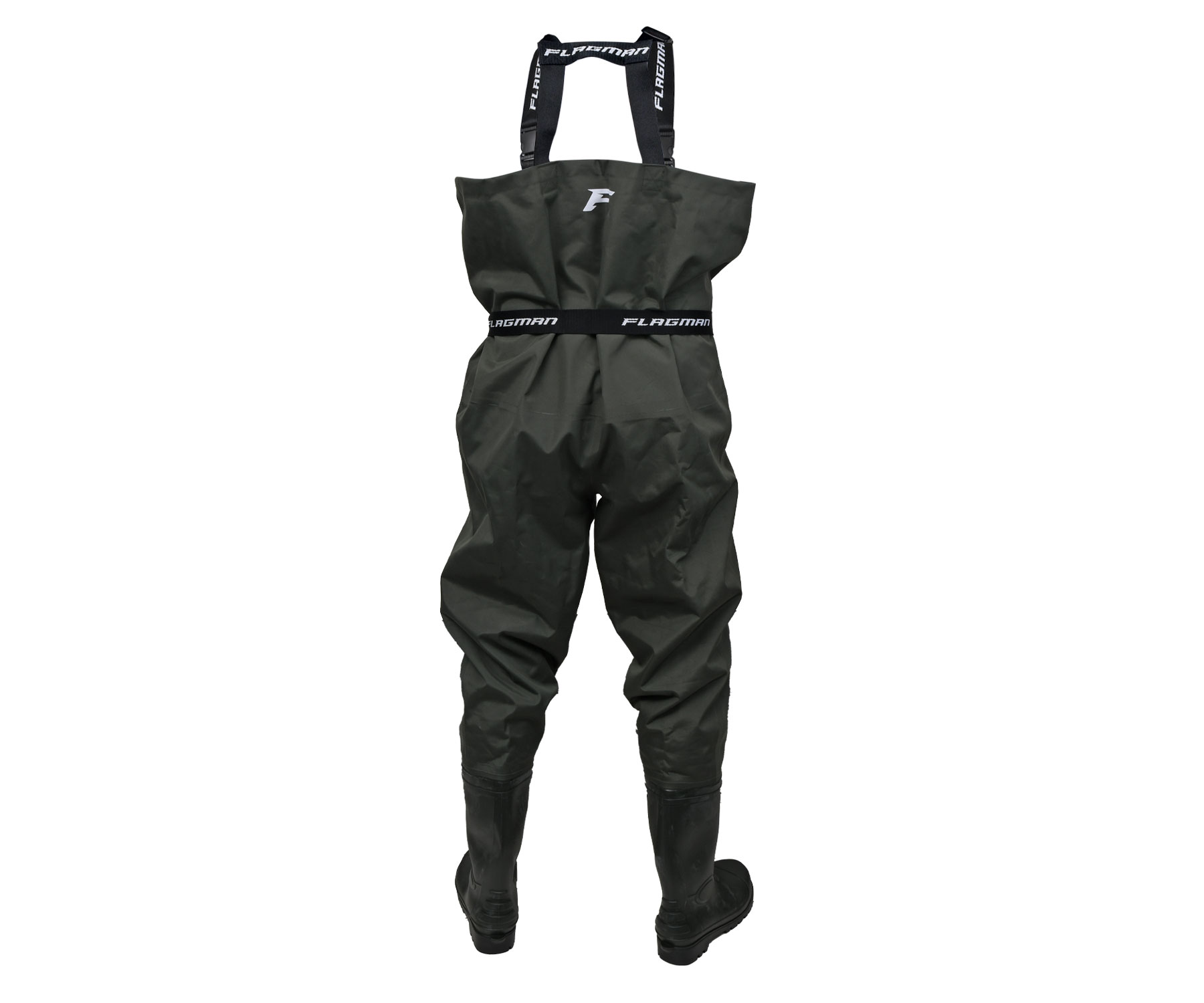 Забродний напівкомбінезон Flagman Stinger Breathable Waterproof Chest Wader –дихаючі вейдерси, які ідеально підійдуть для риболовлі в різноманітних погодних умовах. Цей забродний костюм виготовлено з міцного водонепроникного мембранного матеріалу з інтегрованими в нього чоботами. Водонепроникність матеріалу становить 25000 мм водяного стовпа, а дихаюча здатність – 3000 г/кв.м за 24 години. Міцні гумові чоботи мають зносостійку підошву з товстим глибоким протектором, який запобігає ковзанню на мулистому ґрунті. Усі шви виробу надійно проклеєно, що виключає будь-які протікання води та забезпечує його повну герметичність. Зручні широкі шлейки напівкомбінезона мають надійні пластикові застібки фастекс і регулюються по висоті відповідно до зросту рибалки. Крім того, у конструкції вейдерсів Flagman Stinger Breathable Waterproof Chest Wader передбачені шльовки під ремінь, регульований поясний ремінь із застібкою фастекс, а також містка нагрудна кишеня, що закривається на водонепроникну блискавку. Мембранні вейдерси Flagman Stinger Breathable Waterproof Chest дають змогу перебувати тривалий час у воді, не відчуваючи дискомфорту, не бояться низьких температур і стійкі до впливу ультрафіолетового випромінювання.