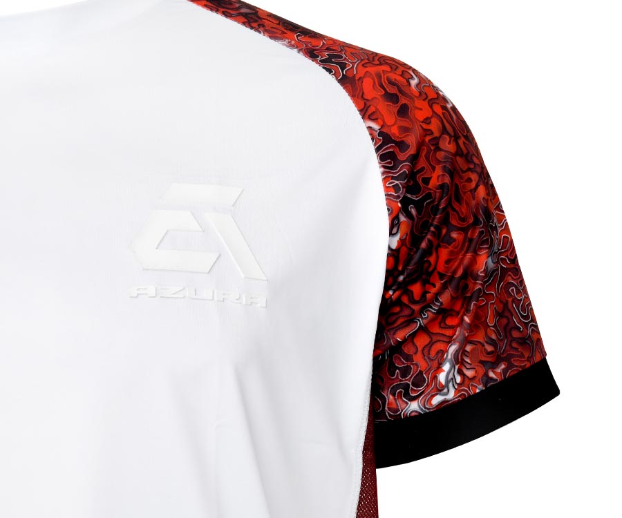 Azura T-Shirt A3 White-Red Camo – стильна, еластична й надзвичайно легка футболка з коротким рукавом, яка ідеально підходить для спекотної літньої погоди як на риболовлі або кемпінгу, так і в повсякденному носінні. М'яка тонка тканина Azura T-Shirt A3 White-Red Camo зі «спортивного» поліестеру забезпечує комфортну температуру тіла за будь-якої спеки, а спеціальна технологія дає змогу волозі швидко всмоктуватися в тканину й безперешкодно виходити назовні. Пласкі шви запобігають натиранню тіла. Футболка має зручний крій зі щільною посадкою по фігурі, швидко сохне, неприємні запахи нейтралізуються. Azura T-Shirt A3 виконано в унікальному авторському дизайні з високим ступенем деталізації.