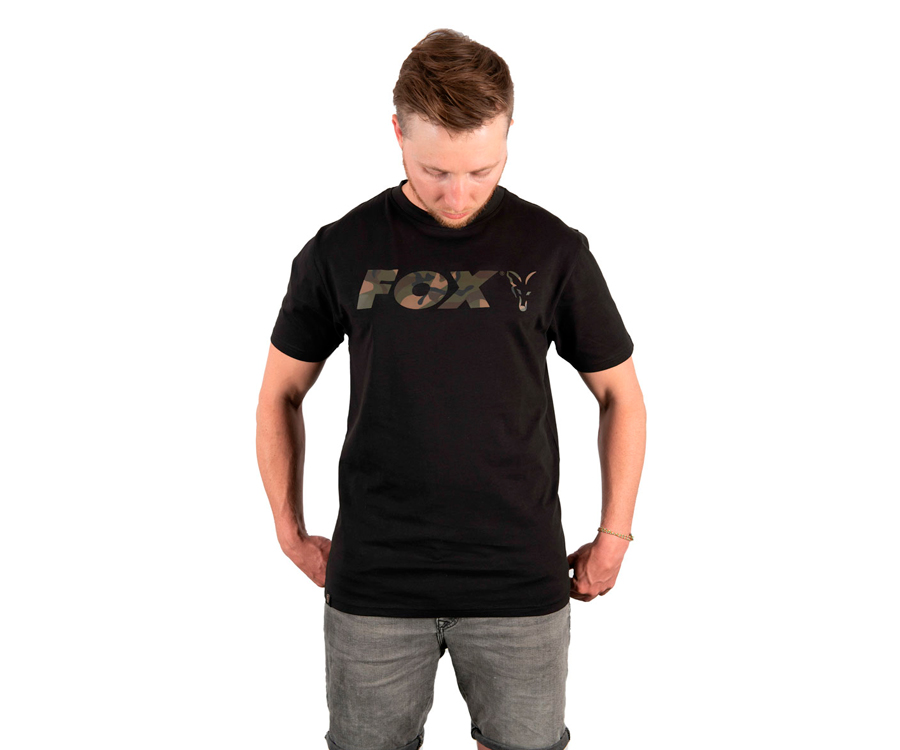 Fox Black/Camo Chest Print T-Shirt – стильна чорна бавовняна футболка з великим камуфляжним логотипом Fox на грудях. Футболка Fox Black/Camo Chest Print T-Shirt має зручний крій, короткі рукави, округлий виріз і практичний колір.