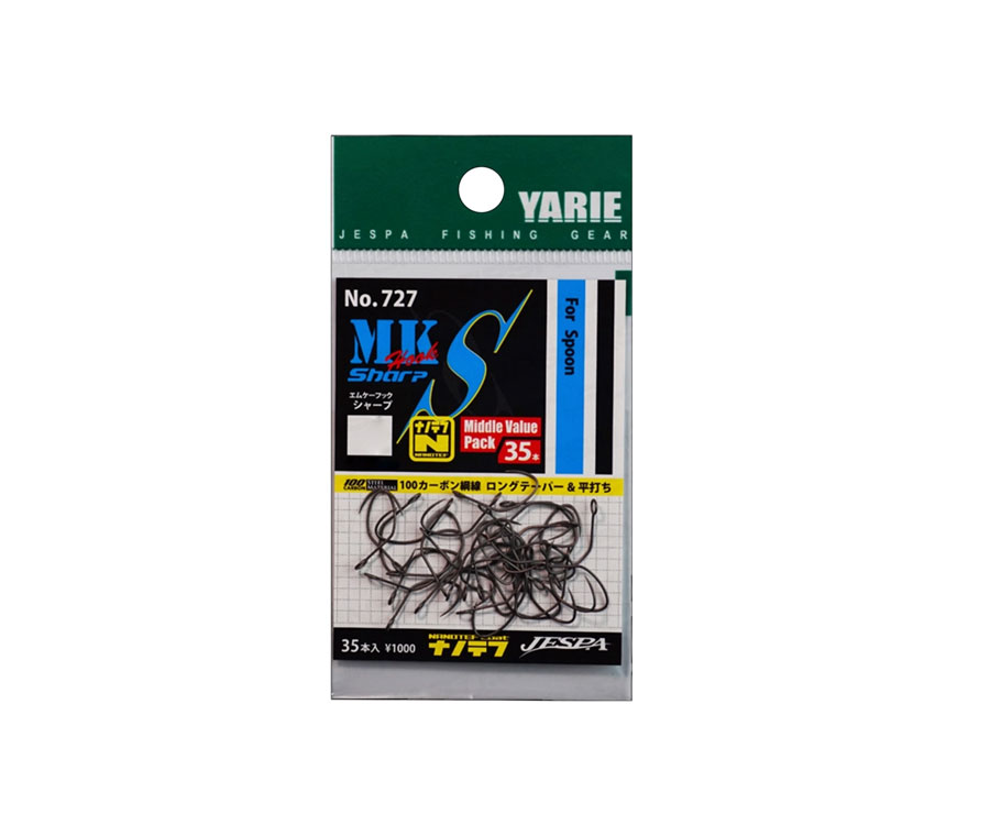 Yarie №727 MK Hook Sharp — це першокласні гачки від популярної японської компанії Yarie. Гачки серії MK — це блешневі гачки, форма і дизайн вигинів розроблялися виключно з необхідності стабільної роботи з найбільшою кількістю типів коливальних блешень. Так модель Sharp — це гачки середньої потужності, готові до використання при швидкісному лові в турнірних умовах. Довге ців'я допомагає досягти балансу з блешнею будь-якої ваги, навіть при тому, що сам гачок подібної потужності важить чимало, і будь-який аналог може заважати роботі блешні. На додаток до всіх переваг, вся серія MK має Nanotef Coat покриття, що дозволяє йому краще входити в рибу навіть при мінімальному контакті.