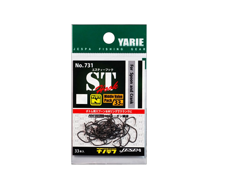 Yarie №731 ST Hook — це першокласні гачки від популярної японської компанії Yarie. Дана модель ідеально підходить для оснащення блешень і кренків, конструкція яких вимагає класичного розташування вушка гачка. Завдяки конструкційним особливостям під час проводки вістря гачка завжди буде дивитися назовні, завдяки чому збільшується засікання при мінімальному часі контакту, а також з'являється можливість використовувати гачок в оснащенні «фронтхук». Коротке ців'я в комбінації з плоским вушком забезпечує відмінний баланс гачка на будь-якій проводці. Гачки мають спеціальне «слизьке» покриття Nanotef Coat, що дозволяє йому краще входити в рибу навіть при мінімальному контакті.