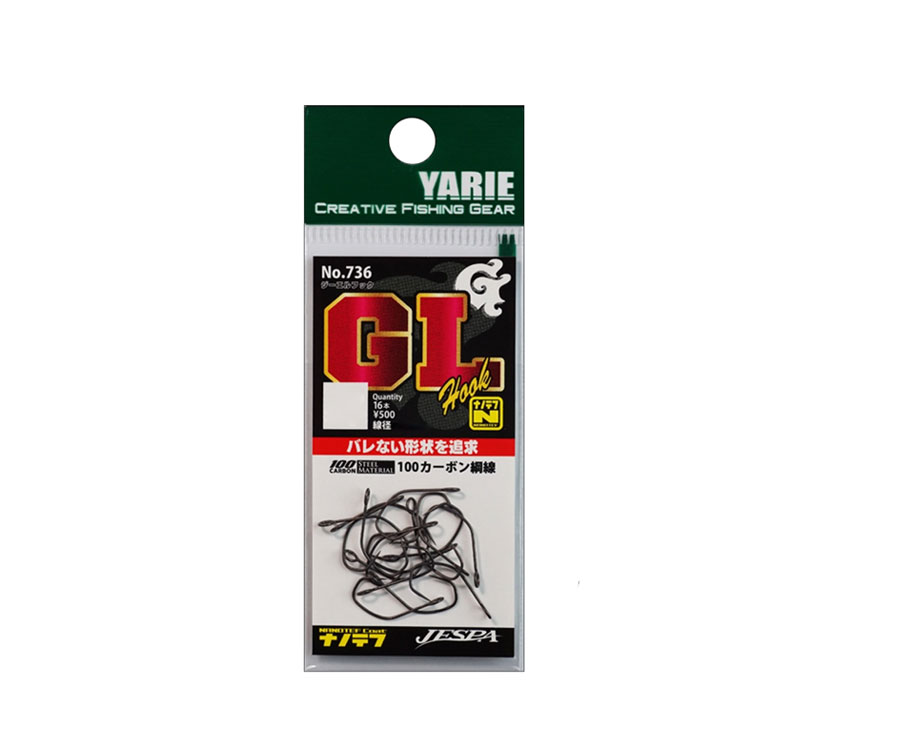 Yarie №736 GL Hook — одинарний гачок для оснащення блешень. Дана модель призначена для оснащення блешень і воблерів. Особлива форма гачка зводить кількість сходів риби до мінімуму. Має тефлонове покриття.