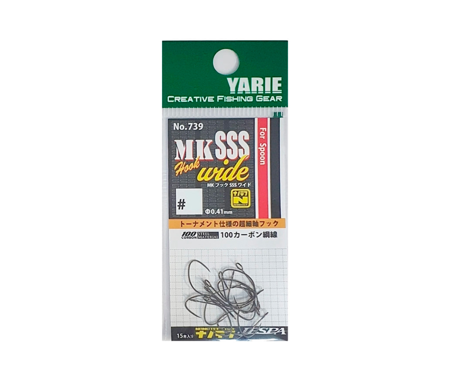 Гачки Yarie 739 MK Hook SSS Wide призначені для спінінгового лову, особливо ефективні під час використання з блешнями, що коливаються, та іншими штучними приманками. Їх вирізняє широка форма, що сприяє надійнішому підсіканню й утриманню риби. Покриття Nanotef підвищує гостроту і проникаючу здатність гачка, знижуючи опір під час проникнення і забезпечуючи надійне підсікання. Гачки доступні в розмірах #6, #7 і #8, що дає змогу підібрати оптимальний варіант для різних умов лову і цільової риби.