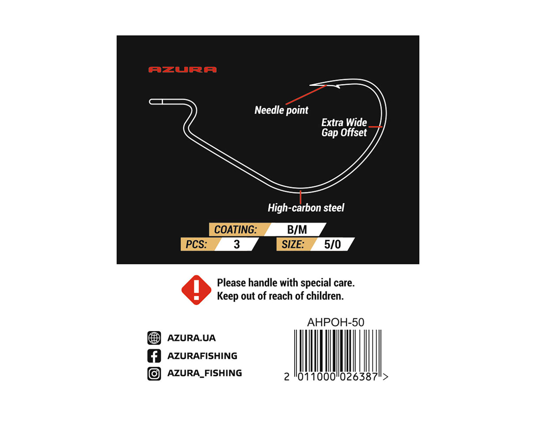 Гачки Azura Hammer Power Offset Hook – потужні офсетні гачки великих розмірів, що розроблені для використання в шарнірних та інших монтажах, які передбачають застосування таких моделей. Azura Hammer Power Offset Hook виготовлені з товстого високовуглецевого сталевого дроту та характеризуються стандартною довжиною цівки, екстра-широкою формою вигину, надійним піддівом, надгострим прямим жалом із заточуванням Needle Point, акуратною чіпкою борідкою та високоякісним антикорозійним покриттям чорного кольору. Офсетні гачки Azura Hammer Power ідеально підходять для оснащення м'яких пластикових приманок найрізноманітніших форм і великих розмірів.